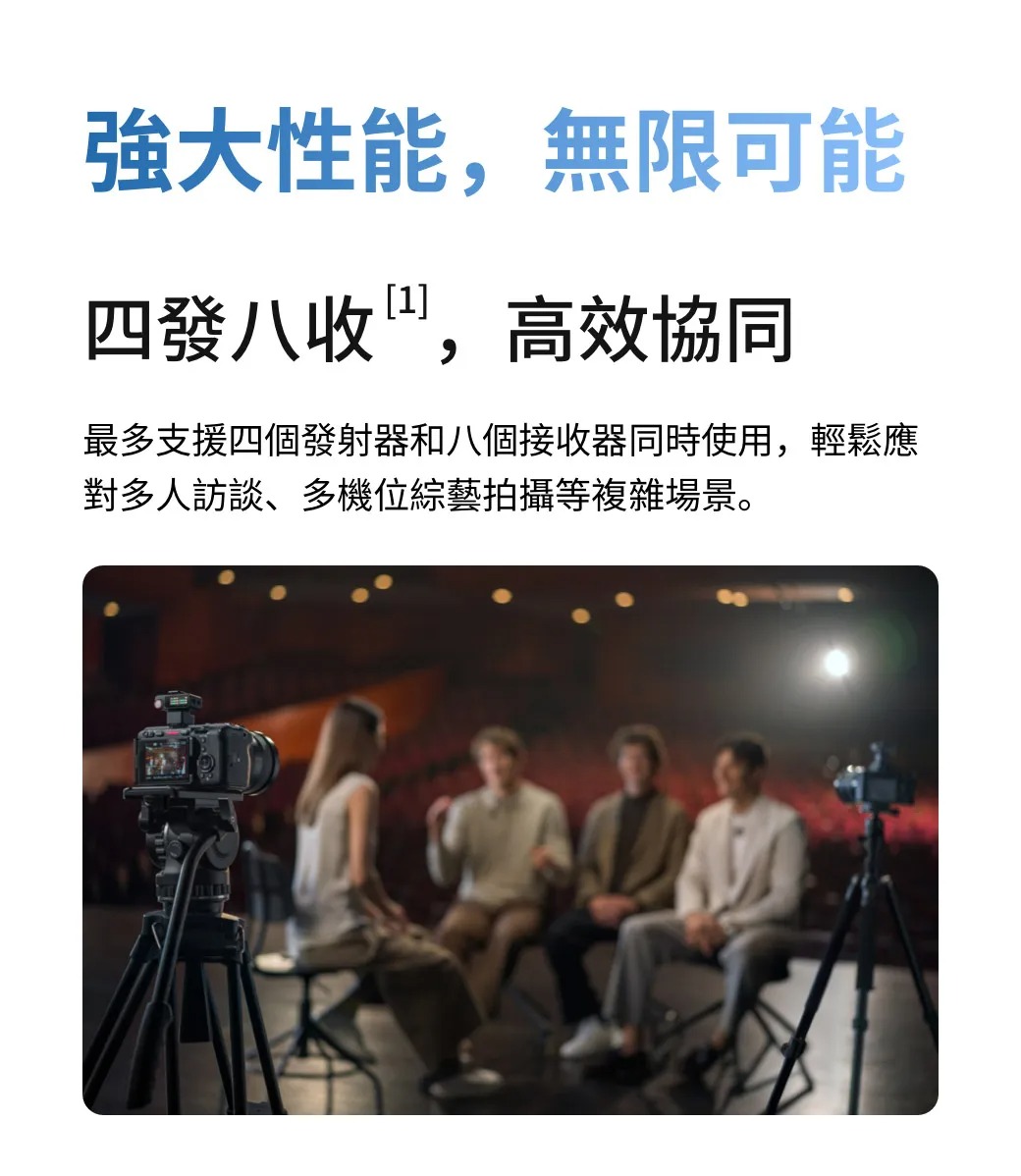 • 強大性能,無限可能四發八收,高效協同最多支援四個發射器和八個接收器同時使用,輕鬆應對多人訪談、多機位綜藝拍攝等複雜場景。