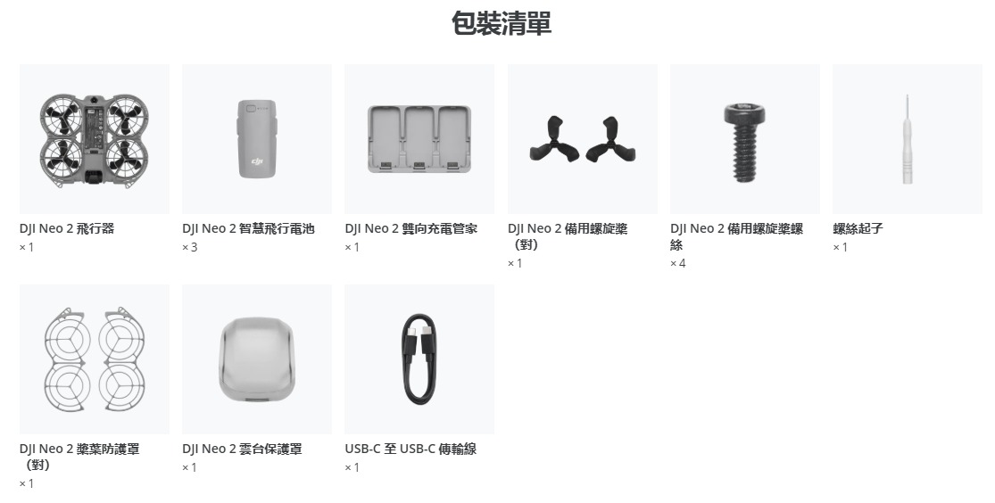 • 具備相關認證且獲取相應空域飛行許可後再飛行。** 本面所列出的各項規格數值,均為量產版 DJI Neo 2 飛行器在受控測試環境下測得,在不同的外部環境、使用方式、韌體版本下,結果或有不同程度的差異,請以實際體驗為準。具體測試條件請查閱 DJI Neo2 產品詳情頁:https://www.dji.com/neo2本頁面所有關於產品本身的圖片、影片及螢幕內容僅供示意,實體產品效果(包括但不限於外觀、顏色、尺寸)及螢幕顯示內容(包括但不限於背景、使用者介面、插圖)可能會有差異,請以實物為準。1. 建議在空曠環境下使用智慧跟隨功能;不支援或可能會中斷錄製的拍攝場景,請詳見使用者手冊。在有較多障礙物的複雜環境下,請謹慎使用自動模式,確保飛行安全和人員安全。2.「全域飛行 DJI Neo 2 在室內及室外均可飛行,且在水面和雪地等場景下飛行性能較前代大幅提升。在衛星定位訊號較弱的情況下,飛行器貼近純色、透明或缺乏紋理特徵的表面飛行時,飛行性能可能會受到影響。請確保在光照良好的環境下謹慎飛行。水面飛行時,請保持至少1公尺高度,以確保飛行安全。其他詳情請查看產品使用手冊。3. 直拍模式下最高解析度為2.7K。4. 4K/100fps 慢動作影片錄製僅在體感操控或遙控器操控時支援。5. 增穩開關僅在搭配飛行眼鏡時可用。增穩功能關閉時,錄製的影片素材支援 Gyroflow 離線增穩。6. 僅支援中文與英文。7. DJI Neo 2 需透過Wi-Fi與手機連線,方能啟用此功能。8. 需搭配 DJI Neo 2 數位影像傳輸模組,並可透過購買特定套裝,或單獨購買指定遙控器與飛行眼鏡來獲取所需裝置。