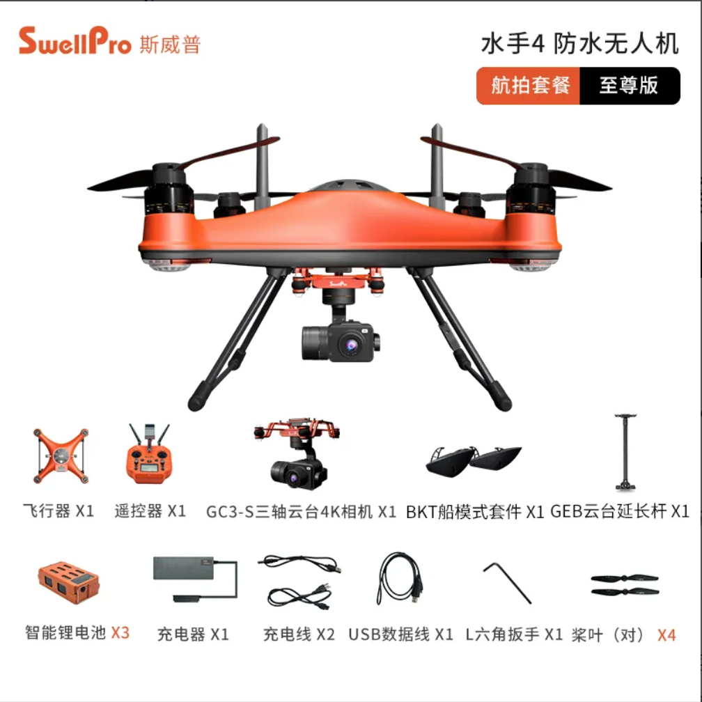 產品介紹 Swellpro 斯威普水手4 是專為戶外愛好者設計的防水無人機,具備強大的防水性能和高畫質4K航拍能力。無論是海上釣魚、救援任務,還是極限運動拍攝,都能輕鬆應對。其IP67級防水設計讓無人機能夠在水面起降,甚至短時間浸泡於水中,極大提升使用的靈活性與安全性。 主要特色 防水設計:IP67防水等級,支持水面起降及浸水操作。 4K高清相機:搭載專業級4K攝影機,畫質細膩,支持高幀率錄影與穩定拍攝。 長續航力:單次飛行時間可達30分鐘,滿足長時間拍攝需求。 遠距離操控:控制距離最遠可達1.5公里,覆蓋更廣闊的拍攝範圍。 智能飛行模式:多種智能模式如自動返航、定點懸停、航線規劃,操作簡便。 多功能應用:適用於航拍、救援、釣魚及戶外探險,功能多元。