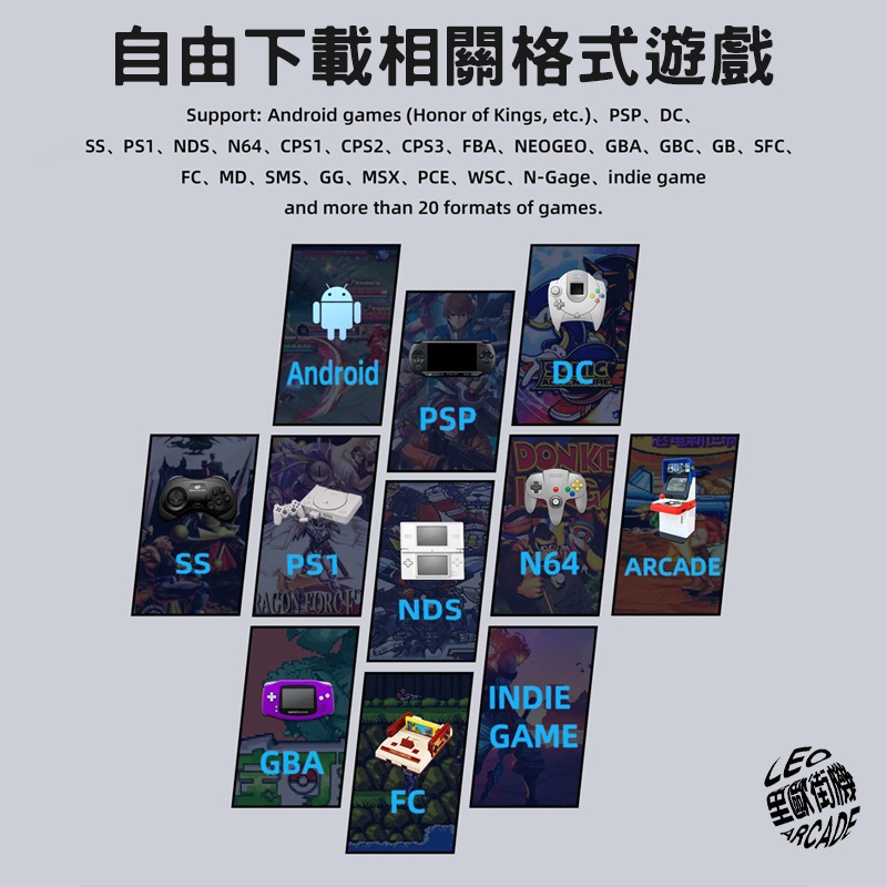 模擬器多達20多種 : PSP、DC、SS、PS1、NDS、N64、CPS123、FBA、NEOGEO、GBA、GBC、GB、SFC、FC、MD、SMS、GG、MSX、PCE、WSC、N-Gage、NAOMI