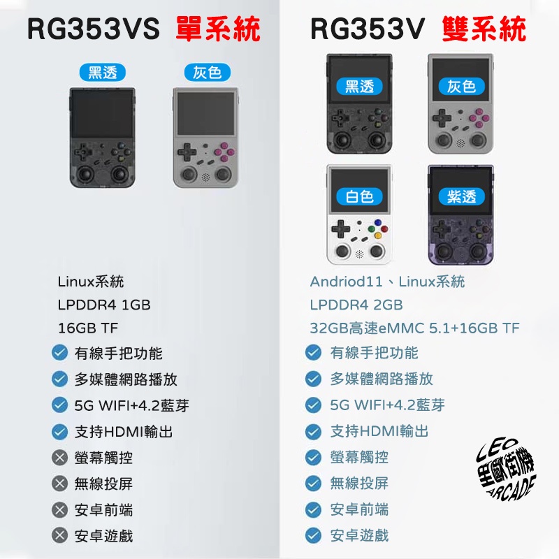 1. RG353V 有2GB 的 RAM,有 Linux 和 Android 兩者操作系統 RG353VS 只有Linux 系統並且採用 1GB 的 RAM,沒有觸摸螢幕功能 2. RG353V在安卓系統下才能使用觸摸螢幕功能,而在Android 設置中,ANBERNIC 還增加了新的功能,可以在菜單即時切換 ABXY 按鈕佈局。 3. 這次RG353V 對於安卓系統下 真正做出了相對應的補定 讓各為玩家們可以更能簡單上手 4. 如果您只想要針對懷舊遊戲的體驗可以考慮RG353VS 這台少了安卓系統 少了研究的感覺 但也能讓玩家們專心在懷舊這套系統下遊玩