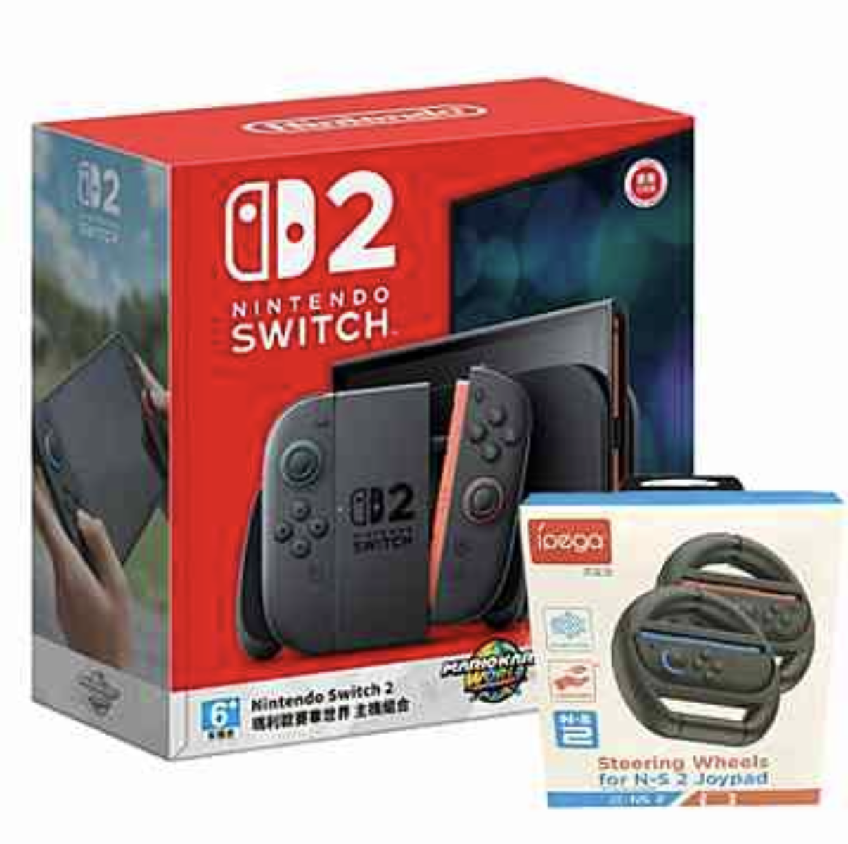 內容有NS2 瑪利歐賽車 世界 同捆主機 *1NS2 副廠方向盤 *1NS2 保護貼 *1