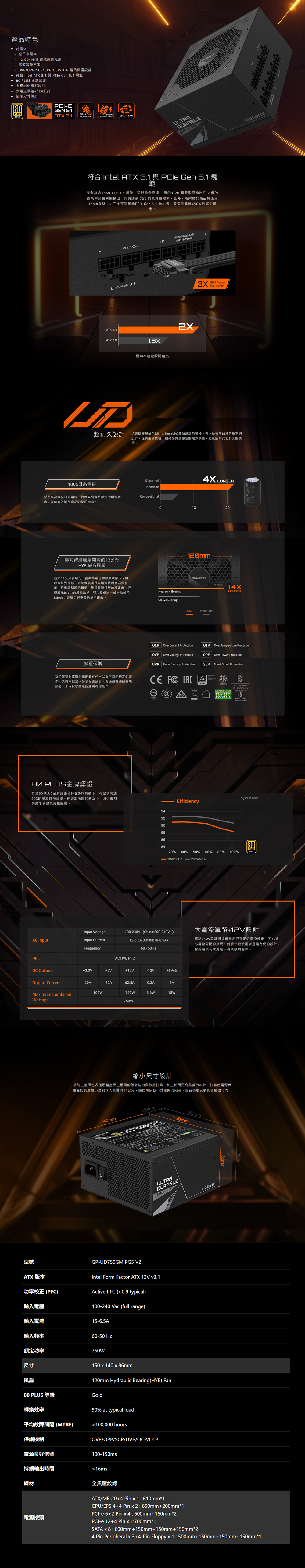 【GIGABYTE 技嘉】750W 80 Plus金牌認證 全模組化 電源供應器 (GP-UD750GM PG5 V2)
