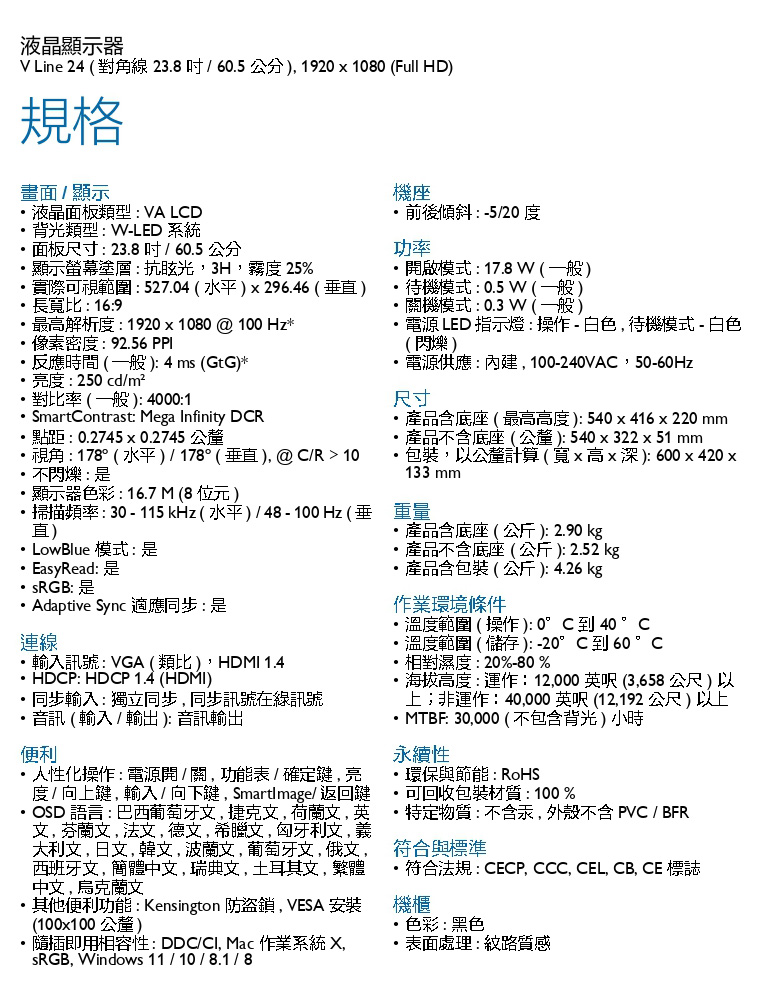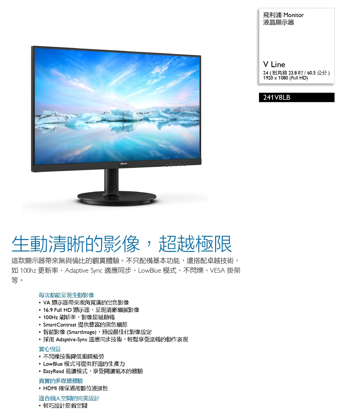 PHILIPS 飛利浦 241V8LB 100Hz窄邊框螢幕(24型/FHD/HDMI/VA)