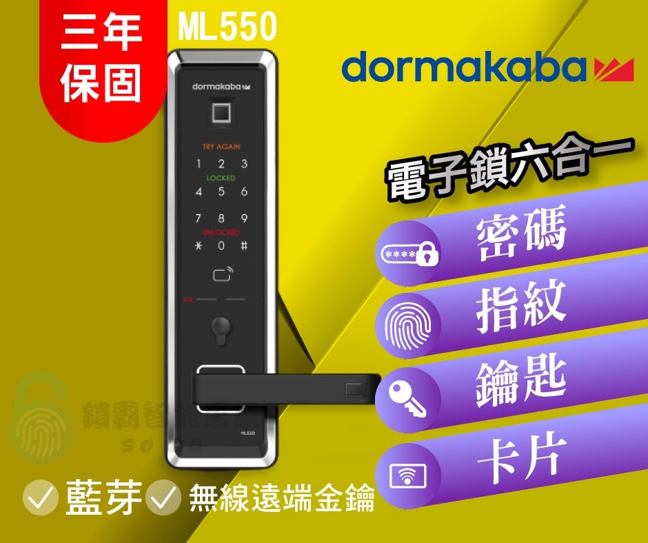 《商品介紹》 全球百大企業之一,百年品牌、德國工藝、品質保證。1862年清朝慈禧太后在就有的品牌,來自德國及瑞士全球三大企業之一。 多瑪凱拔對品質的超高要求,榮獲多項國際大獎,德國著名商標、IF設計獎、German Design Award Special 2017及全球科技前百大企業等。 外掛式智慧輔助電子鎖,適用於多種門扇材質,提供更便利、更不受限的安保解決方案。 作為歷史最悠久的德國門鎖企業製造商之一,dormakaba已經有著超過150年歷史的沉澱,從最早的雙面平板鑰匙, 到被多家銀行及飯店使用的高安 保電子鎖, 集團有著近千份全球專利。 ML550與中保科技集團做居家無限智慧宅整合,帶給您智慧連動,更便利的生活。指紋辨識使用者身分,一個動作完成保全設定或解除並開門。解除保全時連動打開空調、燈光、電視、音樂...等各種家電。還能使用APP遠端為家人開門或上鎖關門,安全同時免去忘記鑰匙的困擾。