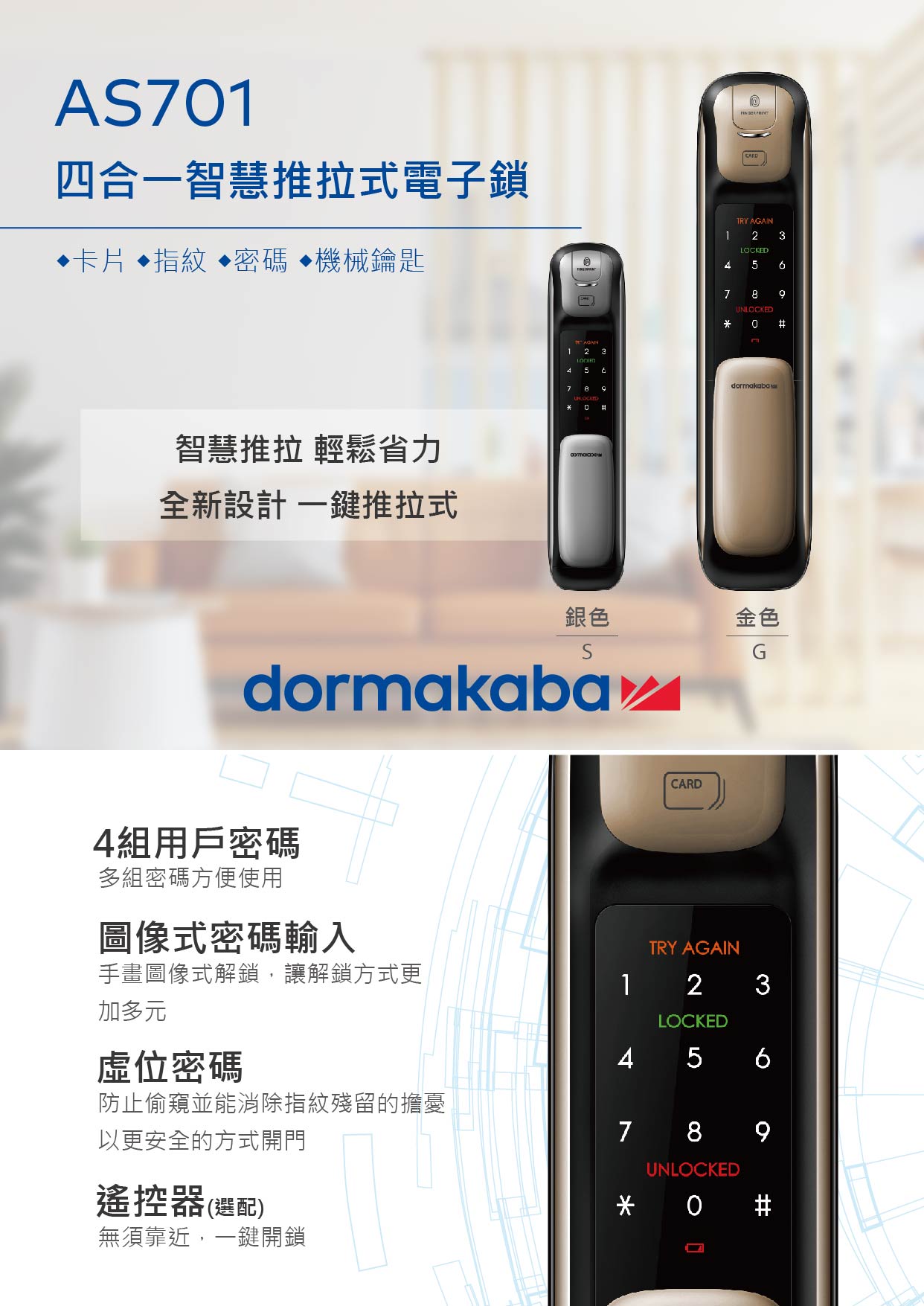 《商品介紹》 全球百大企業之一,百年品牌、德國工藝、品質保證。1862年清朝慈禧太后在就有的品牌,來自德國及瑞士全球三大企業之一。 多瑪凱拔對品質的超高要求,榮獲多項國際大獎,德國著名商標、IF設計獎、German Design Award Special 2017及全球科技前百大企業等。 外掛式智慧輔助電子鎖,適用於多種門扇材質,提供更便利、更不受限的安保解決方案。 作為歷史最悠久的德國門鎖企業製造商之一,dormakaba已經有著超過150年歷史的沉澱,從最早的雙面平板鑰匙, 到被多家銀行及飯店使用的高安 保電子鎖, 集團有著近千份全球專利。 全新設計的高端推拉式智慧電子鎖 AS 701 ,開啟智慧門鎖新時代。輕鬆使用指紋開啟門鎖,進出家門只需把門帶上,鎖體自動鎖定,高效省時。高安保的全自動馬達鎖體,內部安全把手鎖定,多次嘗試的警報功能、高溫警報,多重安全保護,提醒暗藏威脅,實現家門安全等級的全面提升!