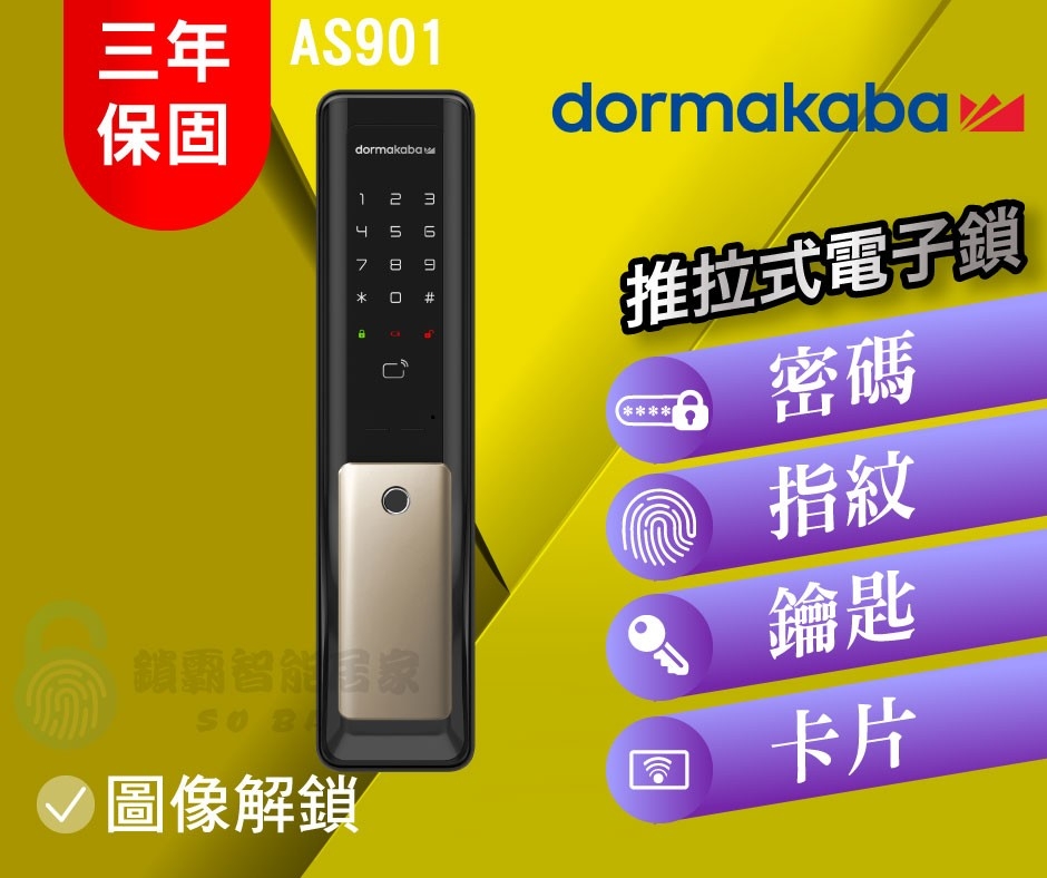 《商品介紹》 【dormakaba】作為歷史悠久的門鎖企業之一,傳承集團百年工藝品質,在科技創新的道路上不斷前進,各種豐富的鑰匙、芯片鑰匙和鑰匙加工機,已使用於世界各地,集團擁有著多項全球專利、通過多項國際認證,榮獲多項國際大獎,提供給您安心保障與最便利的享受。 dormakaba電子鎖,讓你輕鬆過生活~再也不用擔心家人出門忘記帶鑰匙,科技就是讓你無須煩惱! 新一代一鍵式推拉智慧門鎖 AS 901 系列,延續 dormakaba 電子鎖高保安的設計,此鎖採用方便的推拉式把手配合全自動馬達鎖匣,附加一握開門指紋辨識把手及內部安全把手等功能,完整呈現智慧家用電子鎖的全新應用。