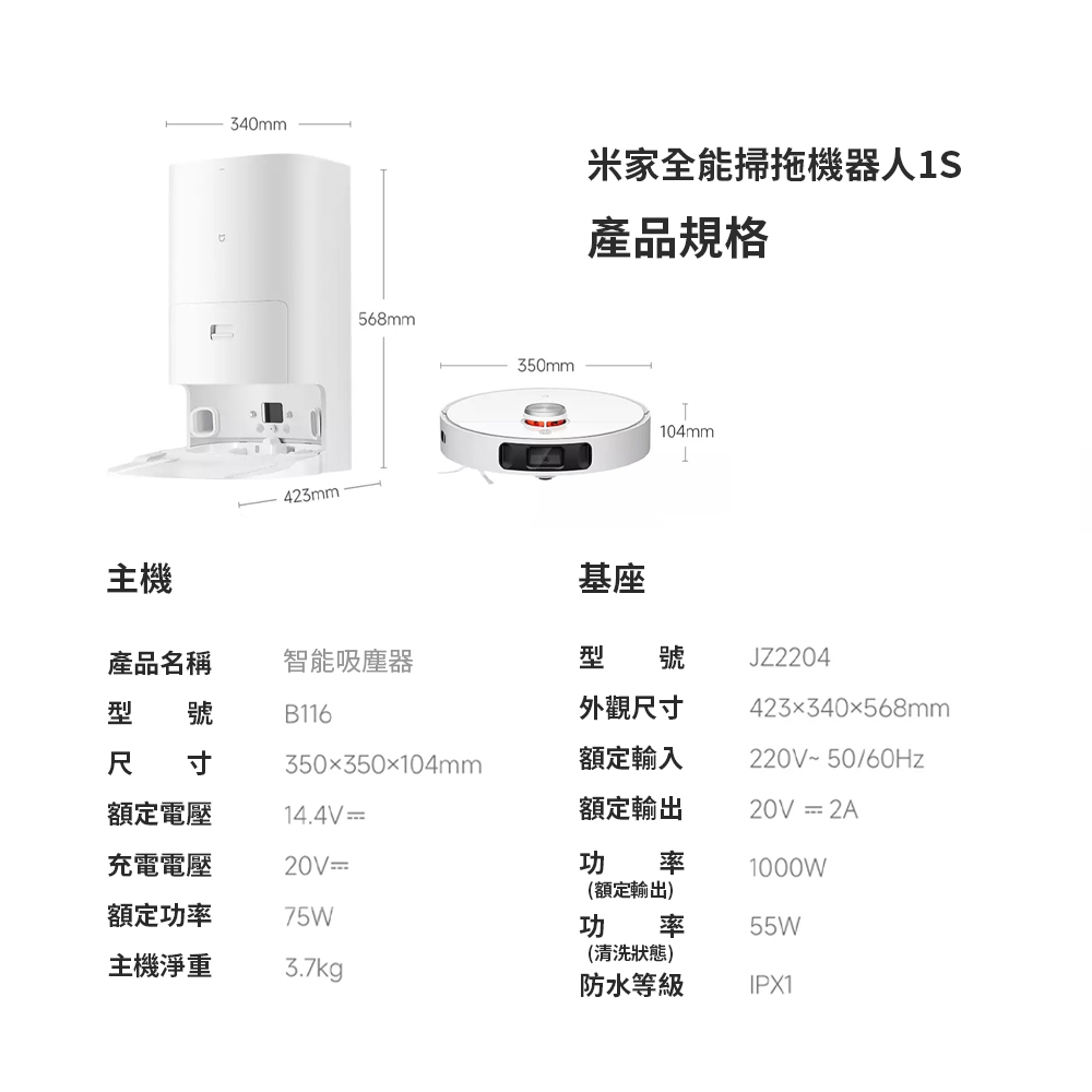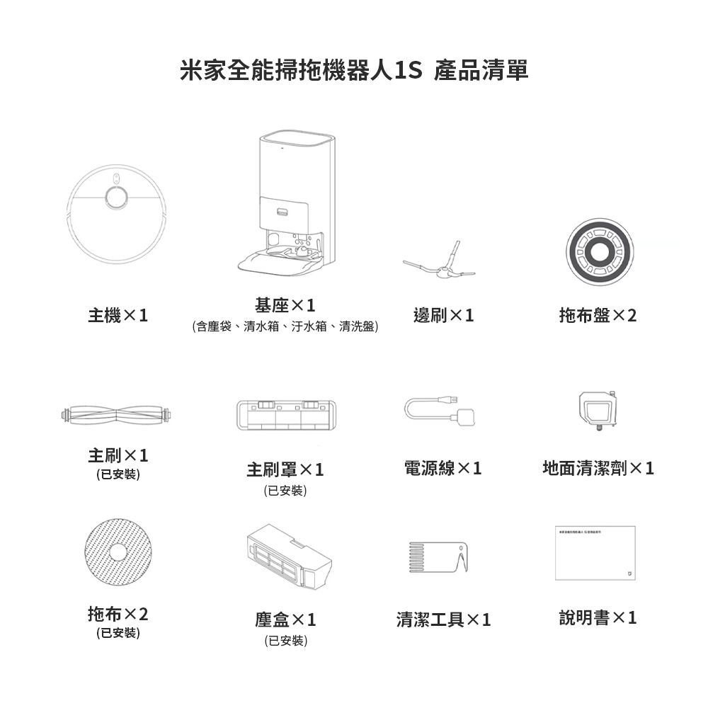 米家全能掃拖機器人1S (福利機)+2000w升壓器 掃拖一體機