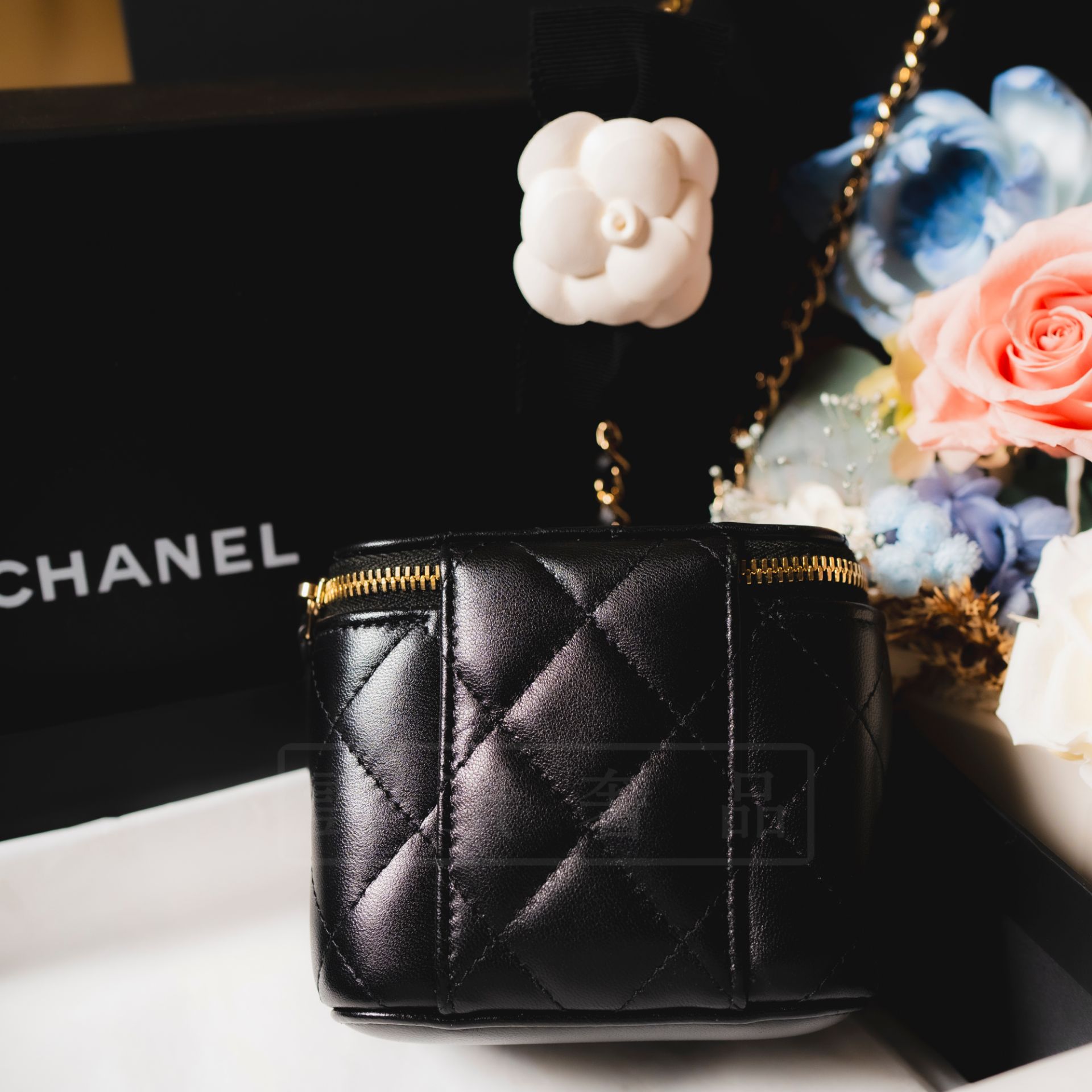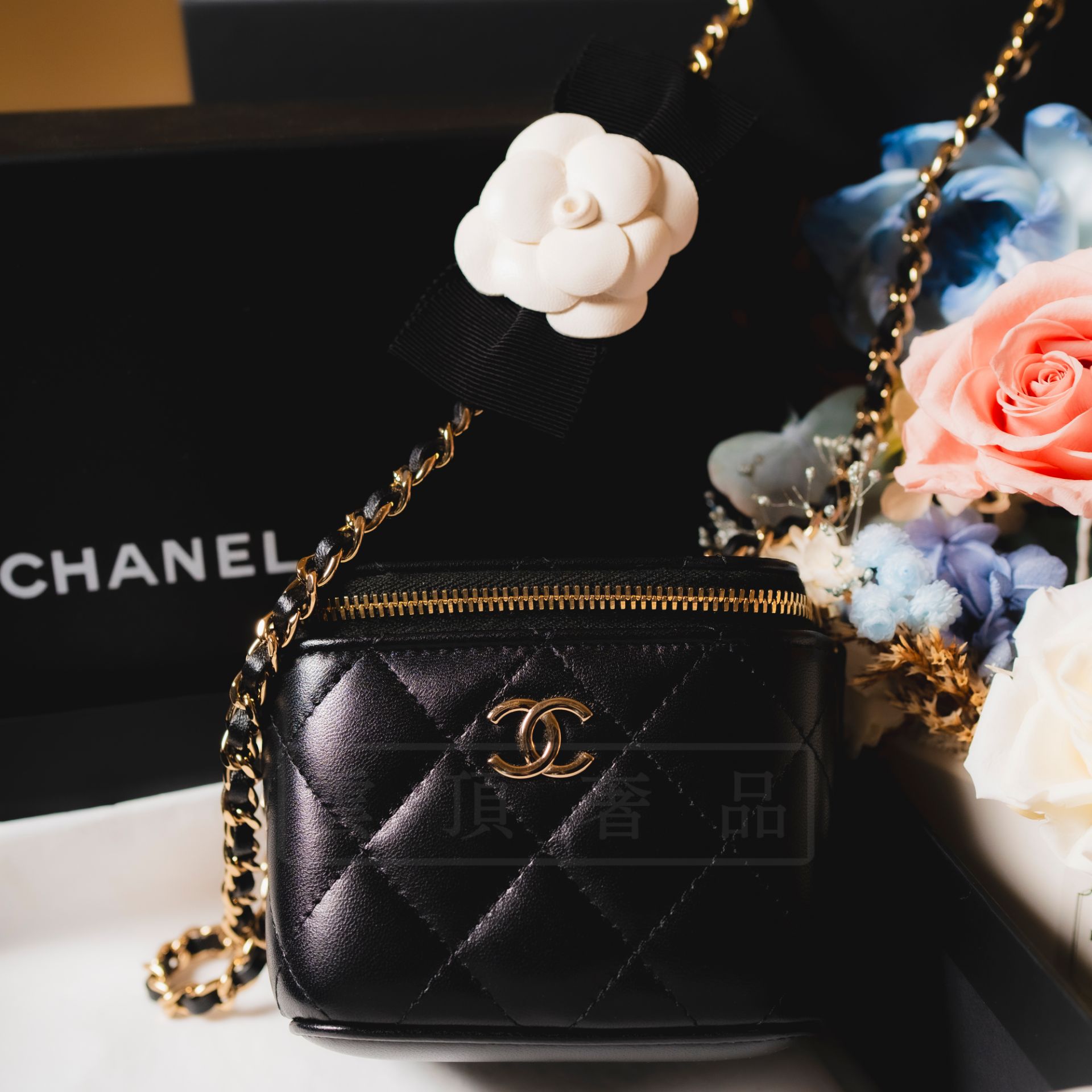 商品名稱:《CHANEL 山茶花 盒子包》售價:$88800年份:2021商品成色:98%新商品描述:黑色 羊皮 山茶花商品配件:肩背帶商品附件:包裝盒、保卡