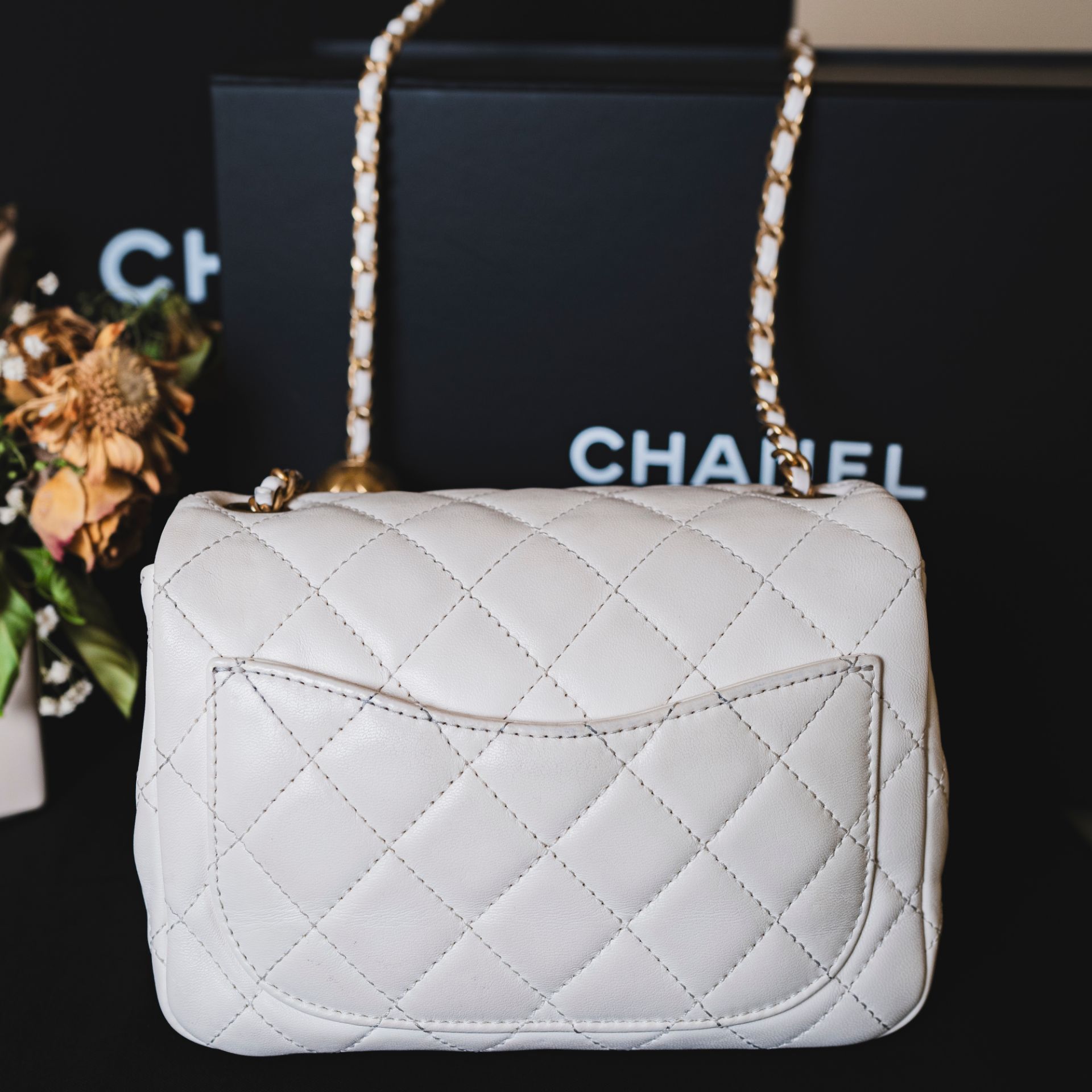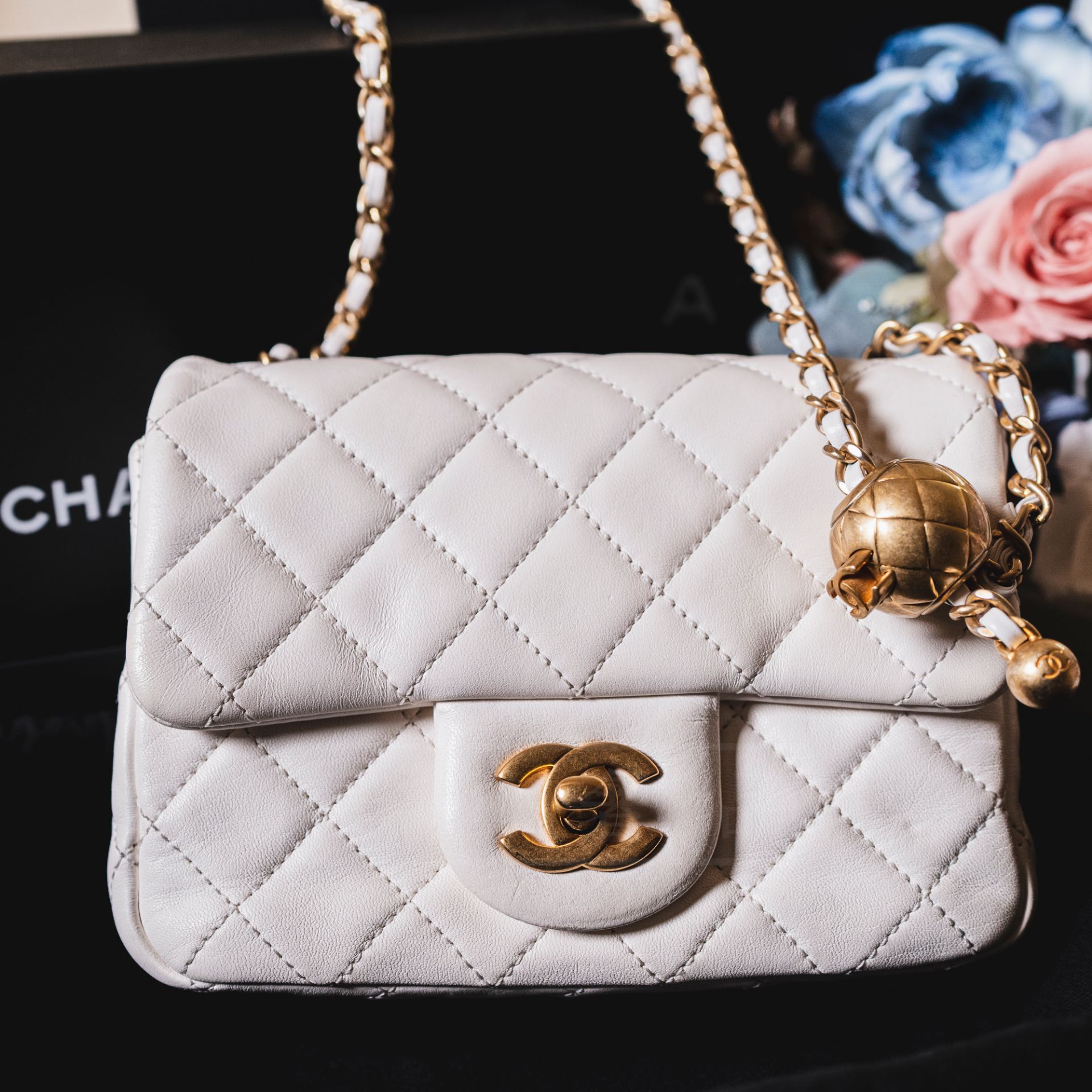 商品名稱:《CHANEL 白色 金球方胖子 芯片款》售價:$120000年份:2017商品成色:90%新商品描述:白色 羊皮 金扣金球 芯片款商品配件:肩背帶商品附件:包裝盒、防塵袋