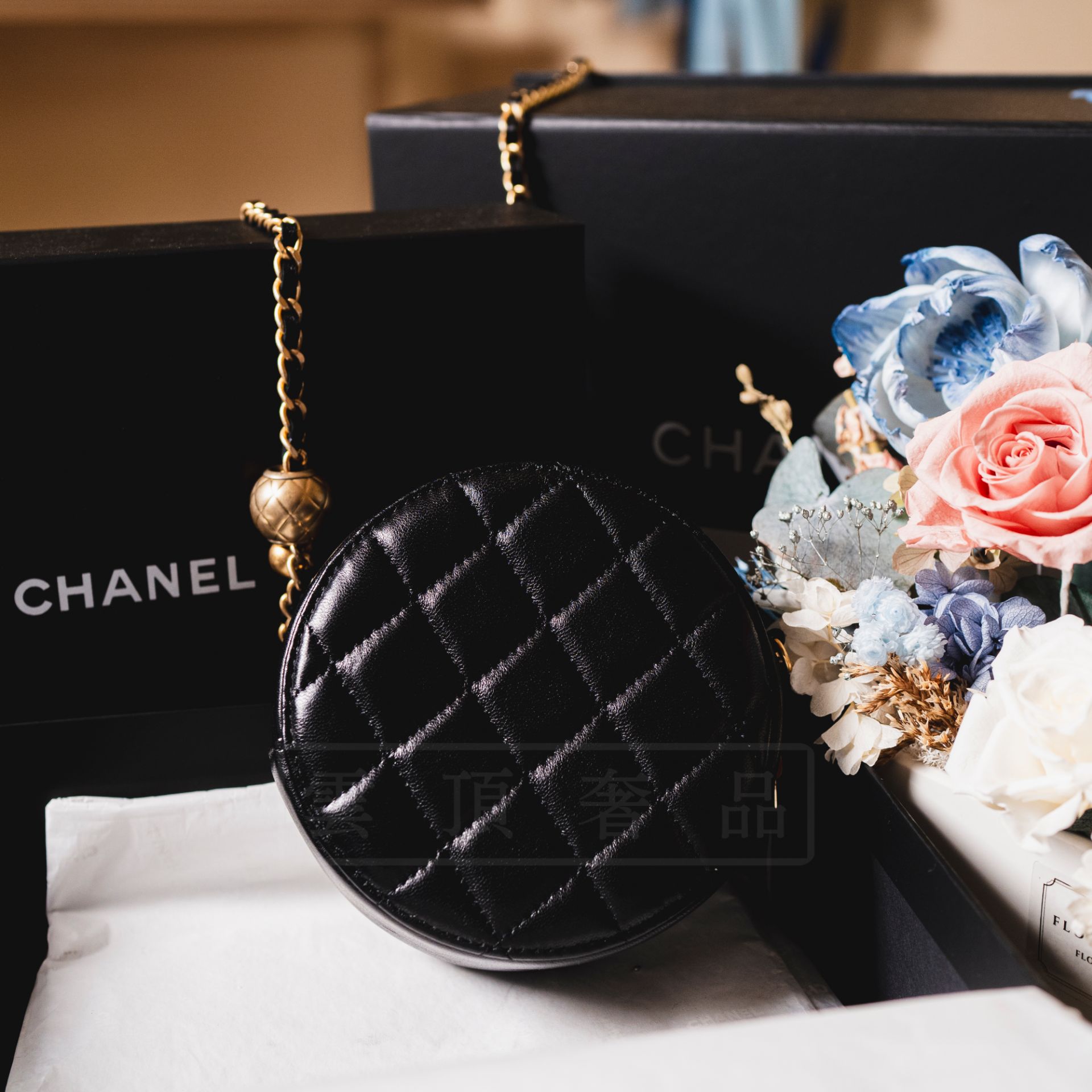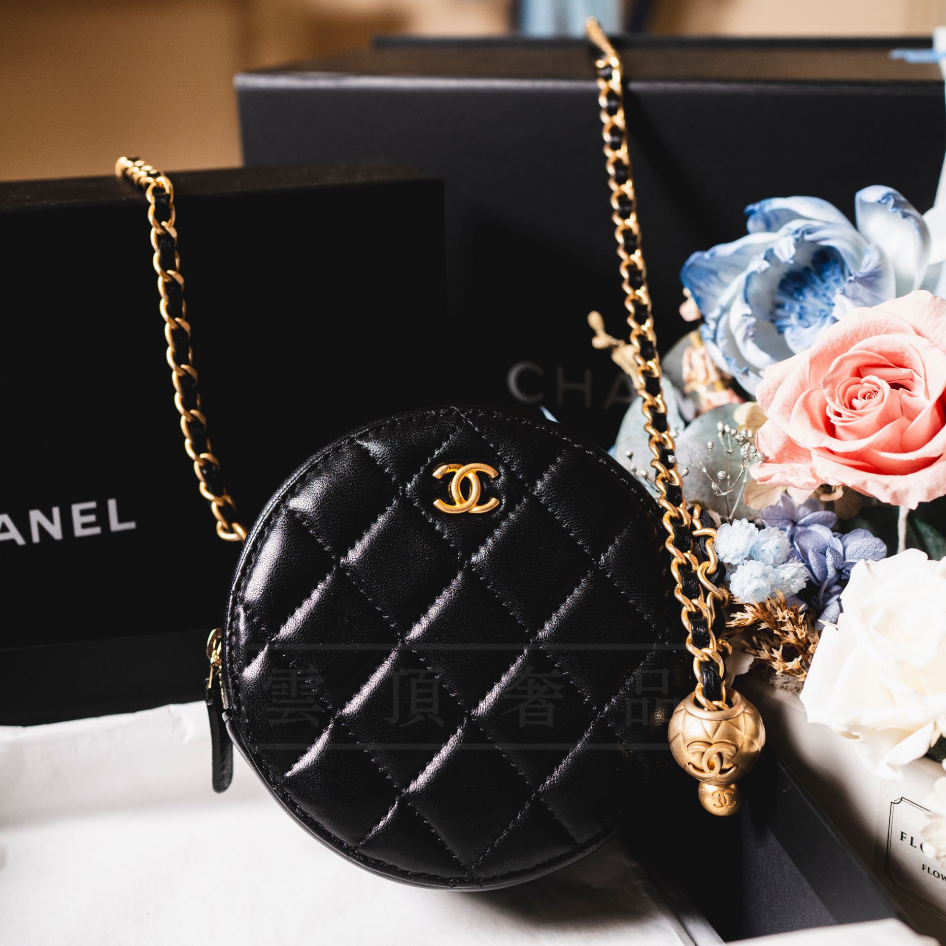 【商品名稱】:《CHANEL 金球圓餅包》【售價】:$74000【年份】:2020【商品成色】:98%新【商品描述】:黑皮 羊皮 金球【商品附件】:包裝盒、保卡、防塵袋