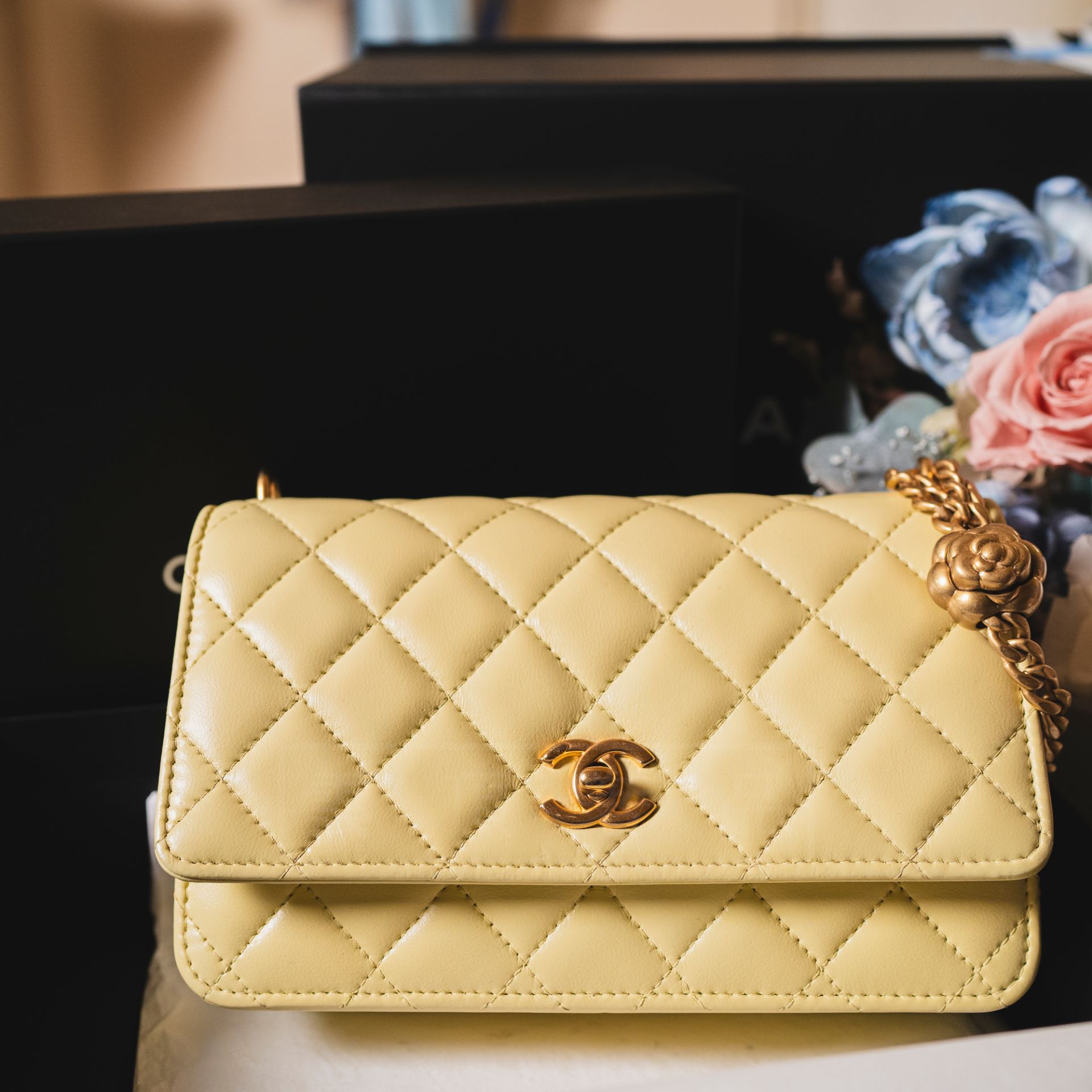 【商品名稱】: 《CHANEL WOC 山茶花 芯片款》【商品售價】:$87600【年份】:2023【商品成色】:90%新【商品描述】:芯片款 小雞黃 可調節肩帶【商品附件】:包裝盒、防塵袋