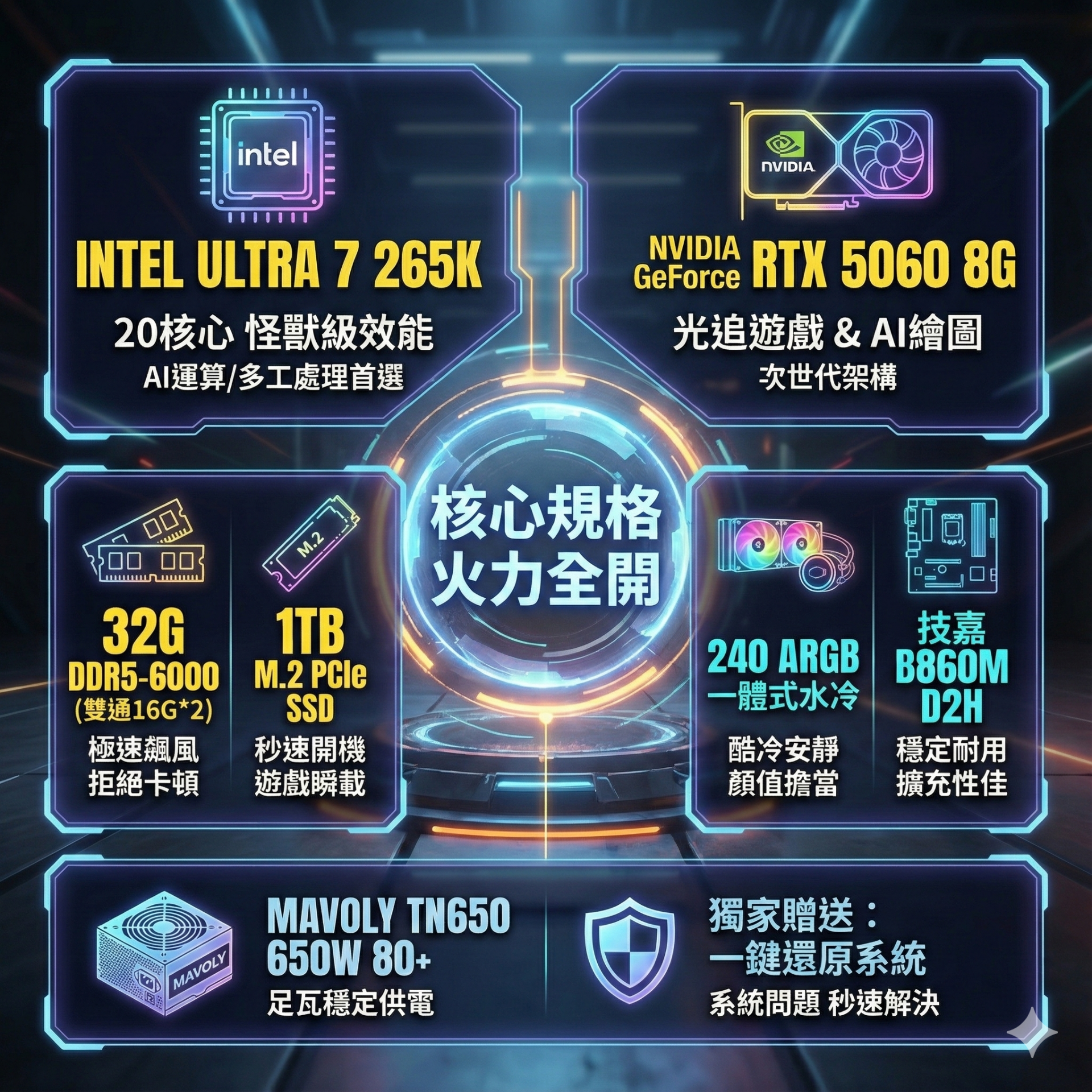 🔥 核心大腦:Intel Core Ultra 7 265K (20核強效處理器)