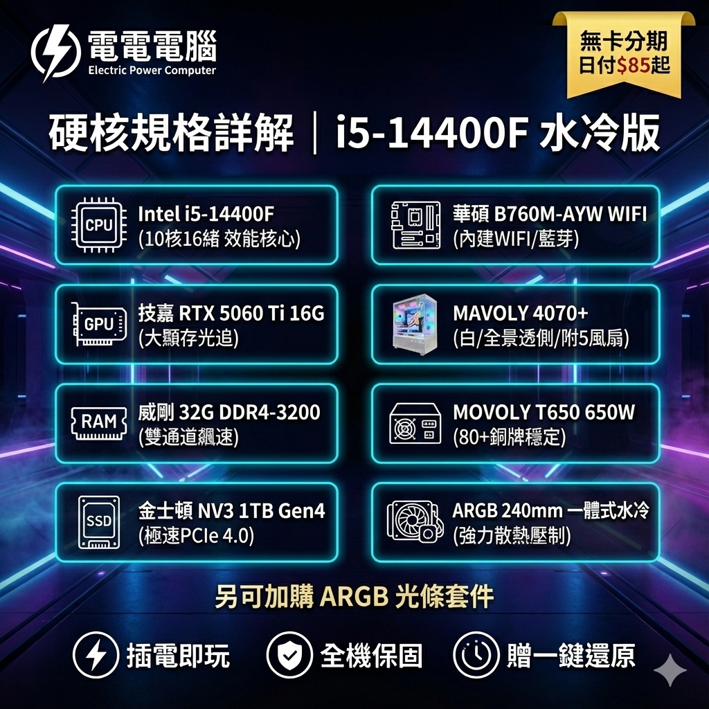 🌈水冷全景獸 i5-14400F + RTX5060Ti 16G | 32G大容量 | 特戰400幀 | 無卡分期日付$85起 | 贈一鍵還原