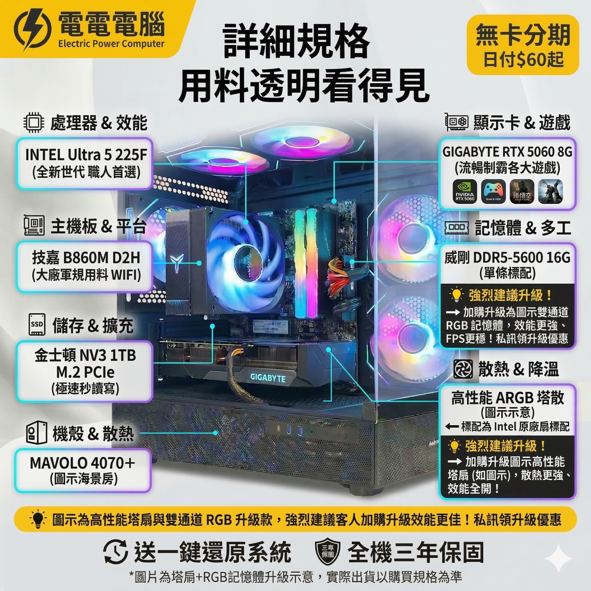 🎮 2026 高 CP 值神機降臨!Ultra 5 225F 聯手 RTX 5060 8G,流暢制霸各大遊戲!