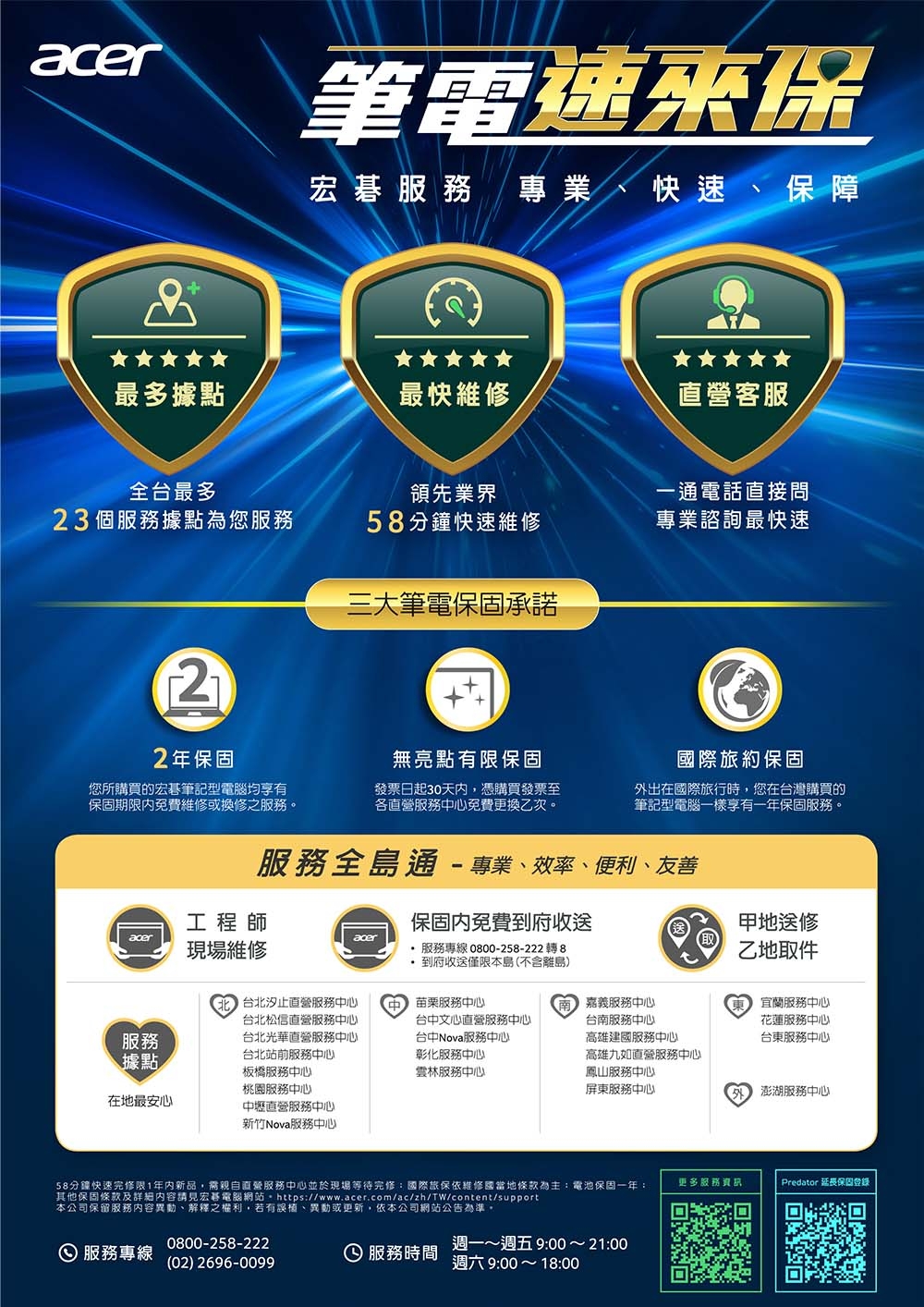 保固:二年台灣地區完全保固/一年國際旅約保固/電池保固一年/第一年58分鐘快速完修