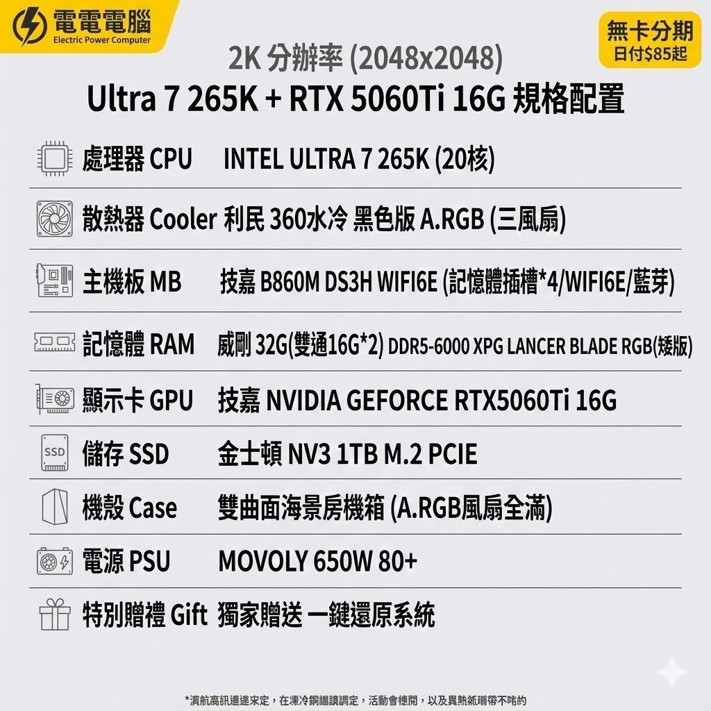 【AI 運算 x 遊戲制霸】Ultra 7 265K 旗艦戰艦|RTX 5060Ti 16G 大顯存|雙曲面無邊界海景房