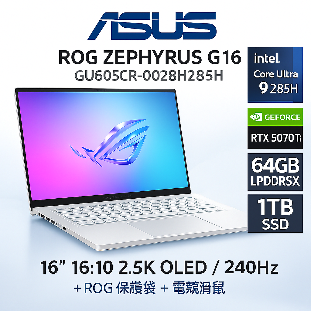 ⭐️ASUS ROG Zephyrus G16 GU605CR-0028H285H-NBLO 鉑月銀 華碩AI西風之神輕薄電競筆電/Ultra 9-285H/RTX5070Ti 12G/64GB LPDDR5X/1TB PCIe/16吋 16:10 2.5K OLED 240Hz/W11/含ROG保護袋及電競滑鼠⭐️