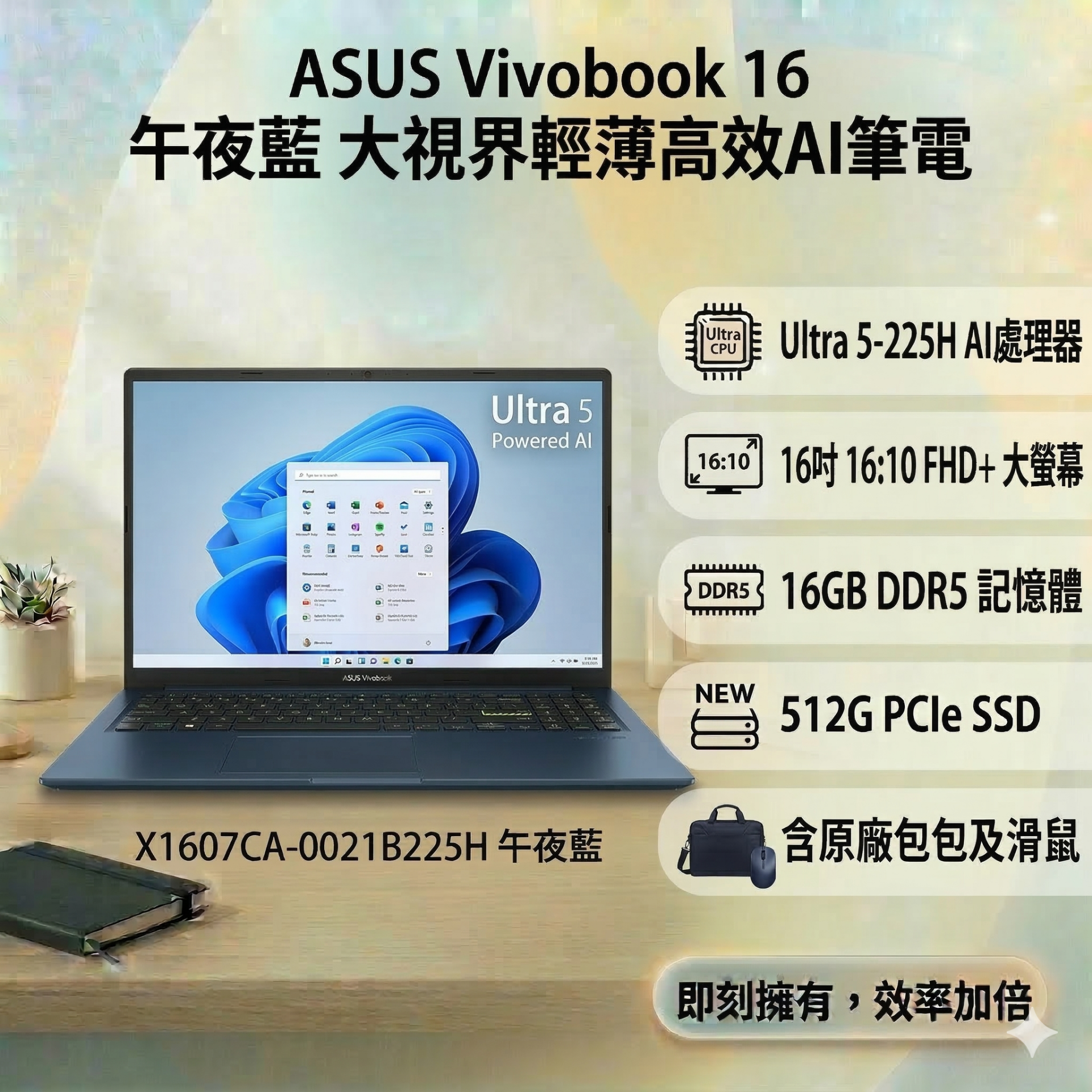 ⭐️ASUS Vivobook 16 X1607CA-0021B225H 午夜藍 華碩大視界輕薄高效AI筆電/Ultra 5-225H/16GB DDR5/512GB PCIe/16吋 16:10 FHD+/W11/含原廠包包及滑鼠⭐️