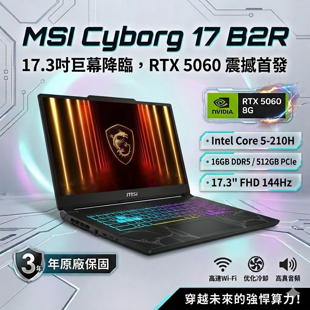 ⭐️MSI Cyborg 17 B2RWFKG-263TW 微星輕薄戰鬥電競筆電/Core 5-210H/RTX5060 8G/16GB DDR5/512GB PCIe/17.3吋 FHD 144Hz/W11/四區RGB鍵盤背光/3年保⭐️