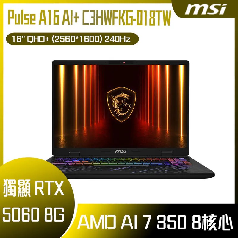 ⭐️MSI Pulse A16 AI+ C3HWFKG-018TW 微星AI超滿血電競筆電/Ryzen AI 7 HX 350/RTX5060 8G/16GB DDR5/512GB PCIe/16吋 16:10 QHD+ 240Hz/W11/RGB背光電競鍵盤⭐️