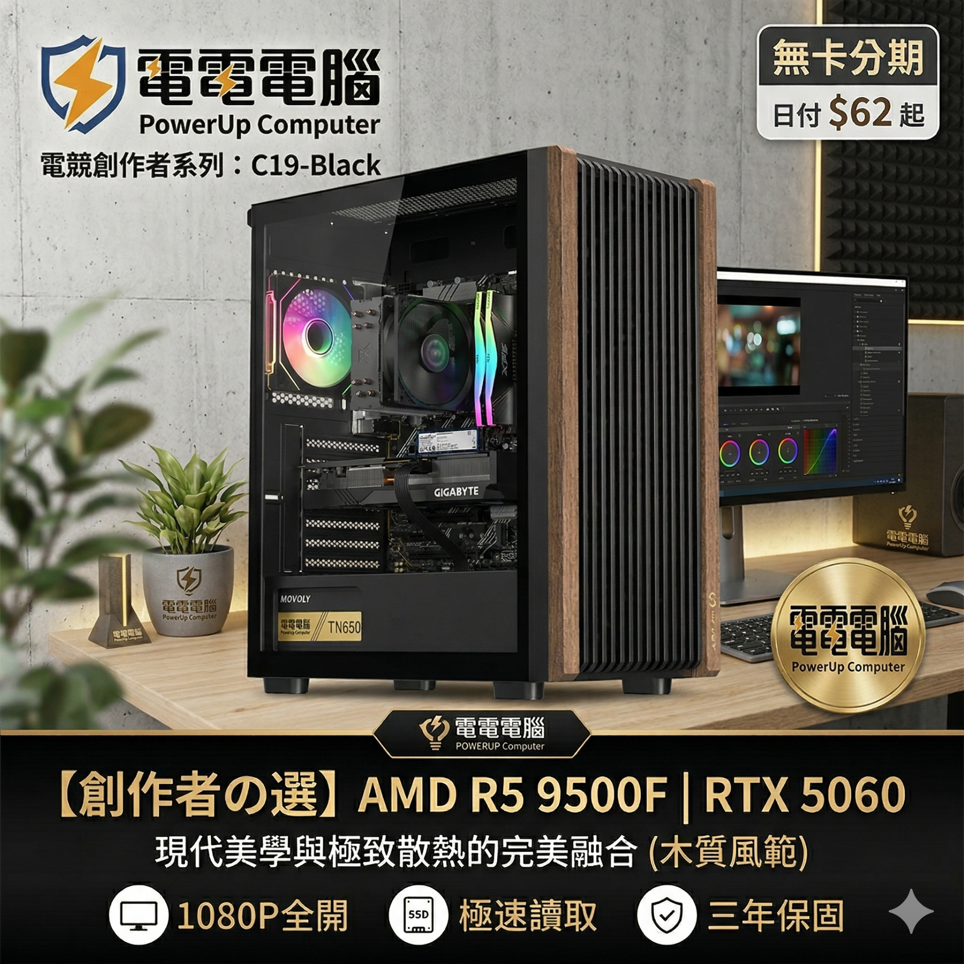🔥 【R5 9500F | RTX 5060】INFINITE TIMBER C19 黑 — 現代居家美學,散熱與顏值兼具的創作者主機,日付 $62 起! 🔥