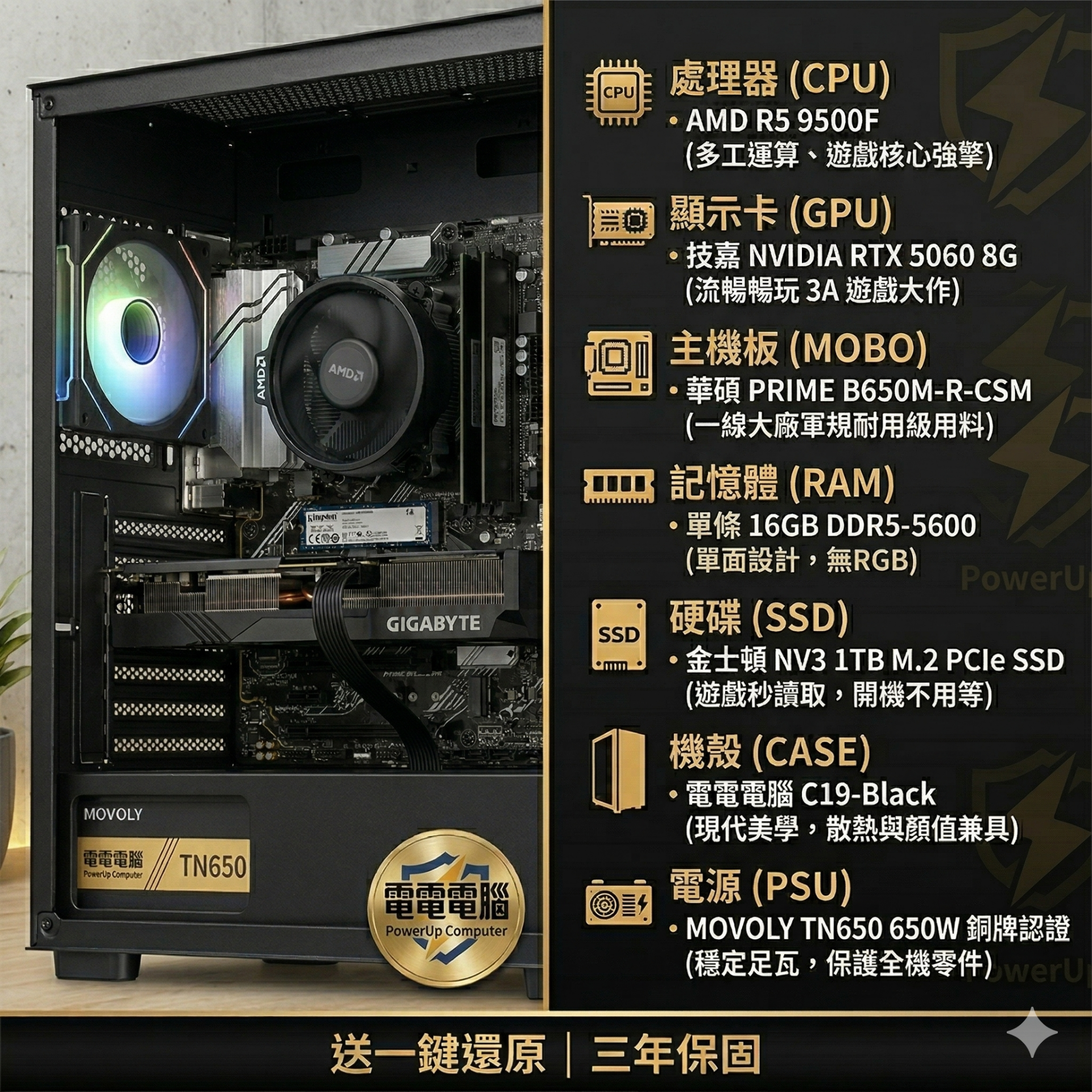 圖片 電電電腦「戰神主力」R5 7500F x RTX5060 8G 全新高氣流電競主機・日付$72起・極致把關送三年保固!