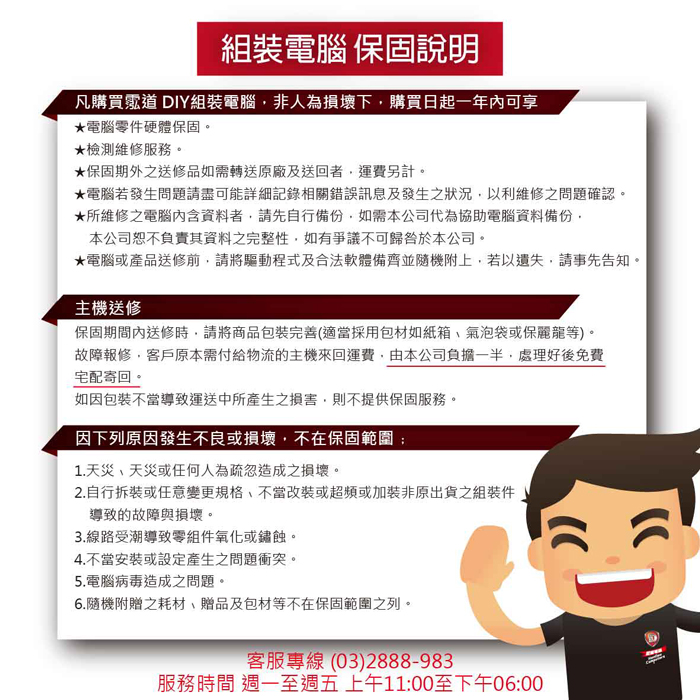 保固:一年硬體保固服務 (機殼風扇、贈品為耗材不在此保固範圍)