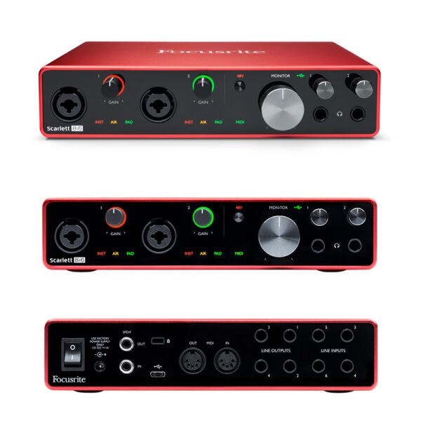 六個平衡線路輸入,用於連接合成器或其他線路電平音頻,四個平衡輸出,用於監聽和效果發送 兩款性能最佳的 Scarlett 麥克風前置放大器 – 現在使用 Air – 用於錄製人聲 兩個高動態餘量樂器輸入,用於直接插入吉他或貝斯 環回,用於獲取硬件輸入和軟件播放的任意組合的立體聲饋送,無需電纜,用於簡單採樣、流媒體或播客