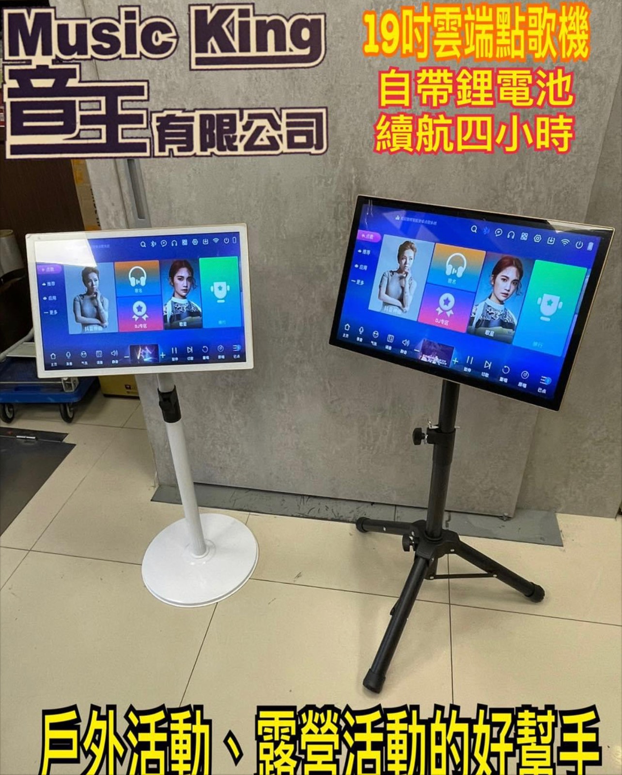 9吋雲端點歌機,自帶鋰電池,充滿電約顆使用四個小時,有藍芽發射功能,可以與藍牙音箱做無線連接,非常適合戶外、露營等活動使用,遠端曲庫的部分有58萬首,新歌連網路自動更新
