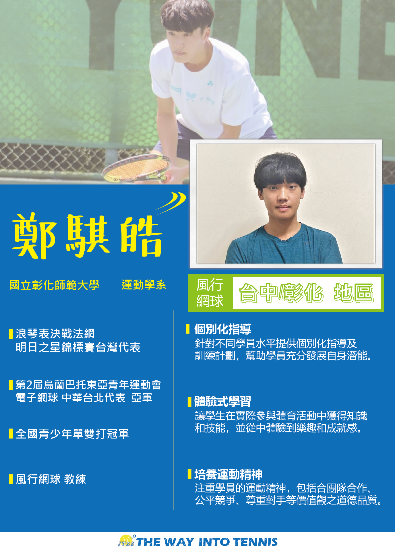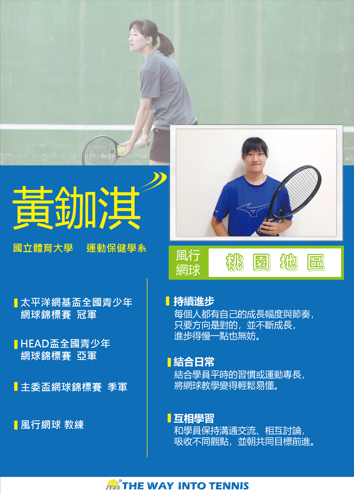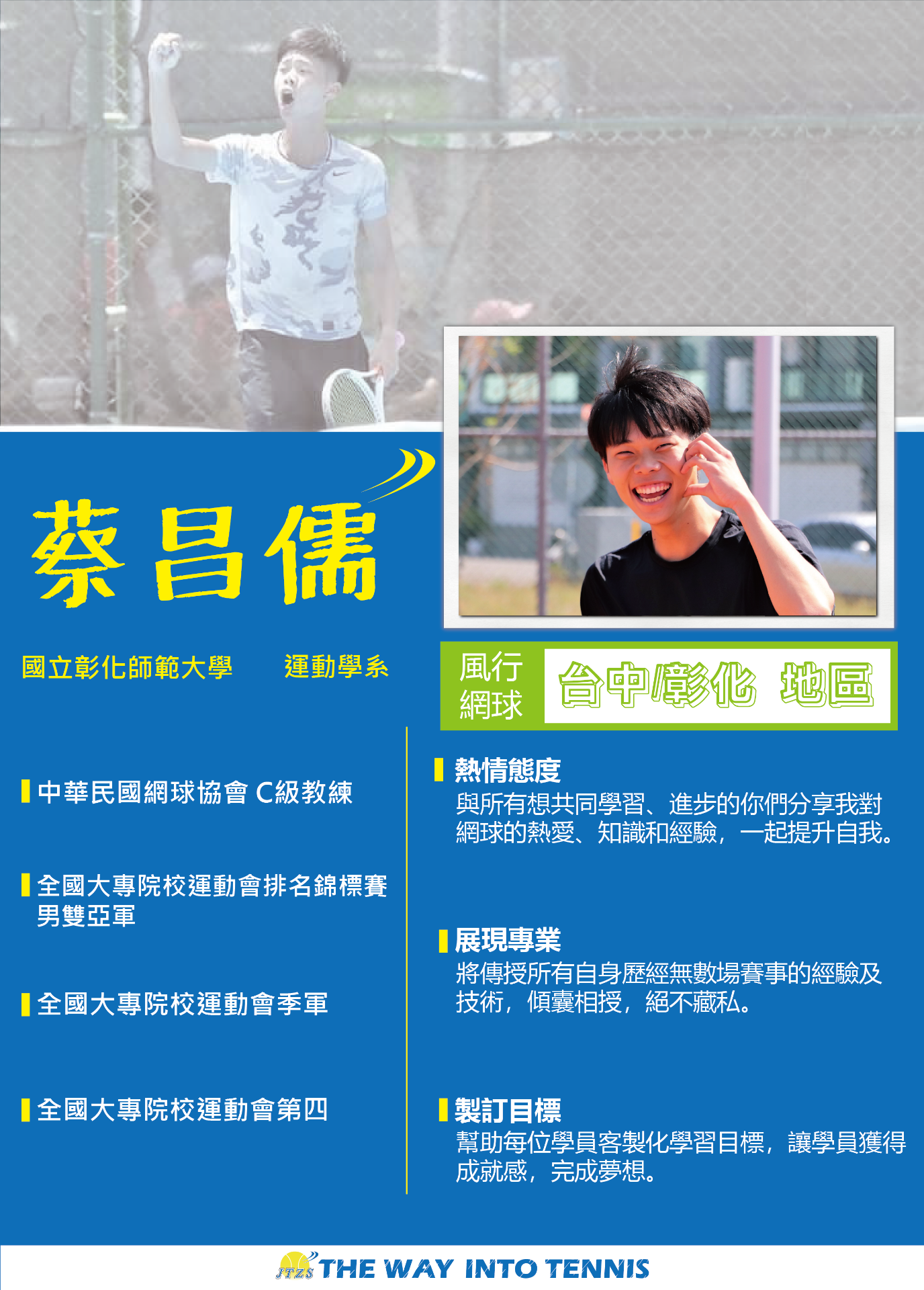 讓網球風行是多少網球愛好者、網球教練的嚮往,把這一個心願化作了一步又一步的真實,讓網球如風一般行走在臺灣的大街小巷,行走在每個人的心中。