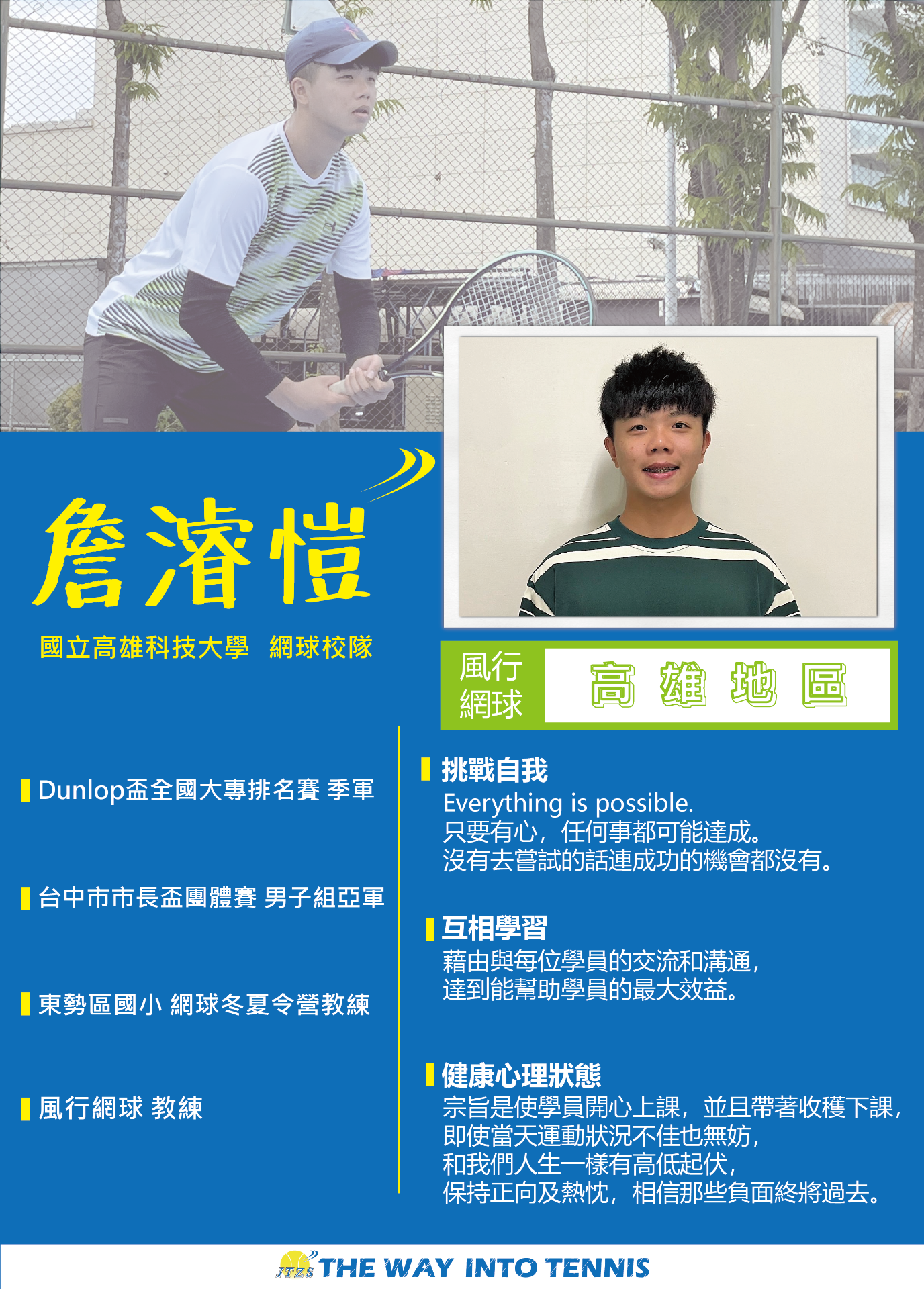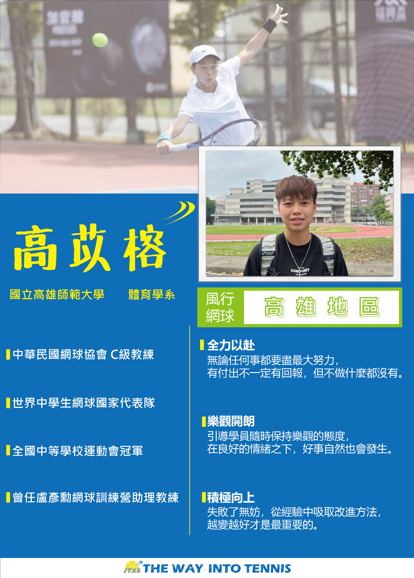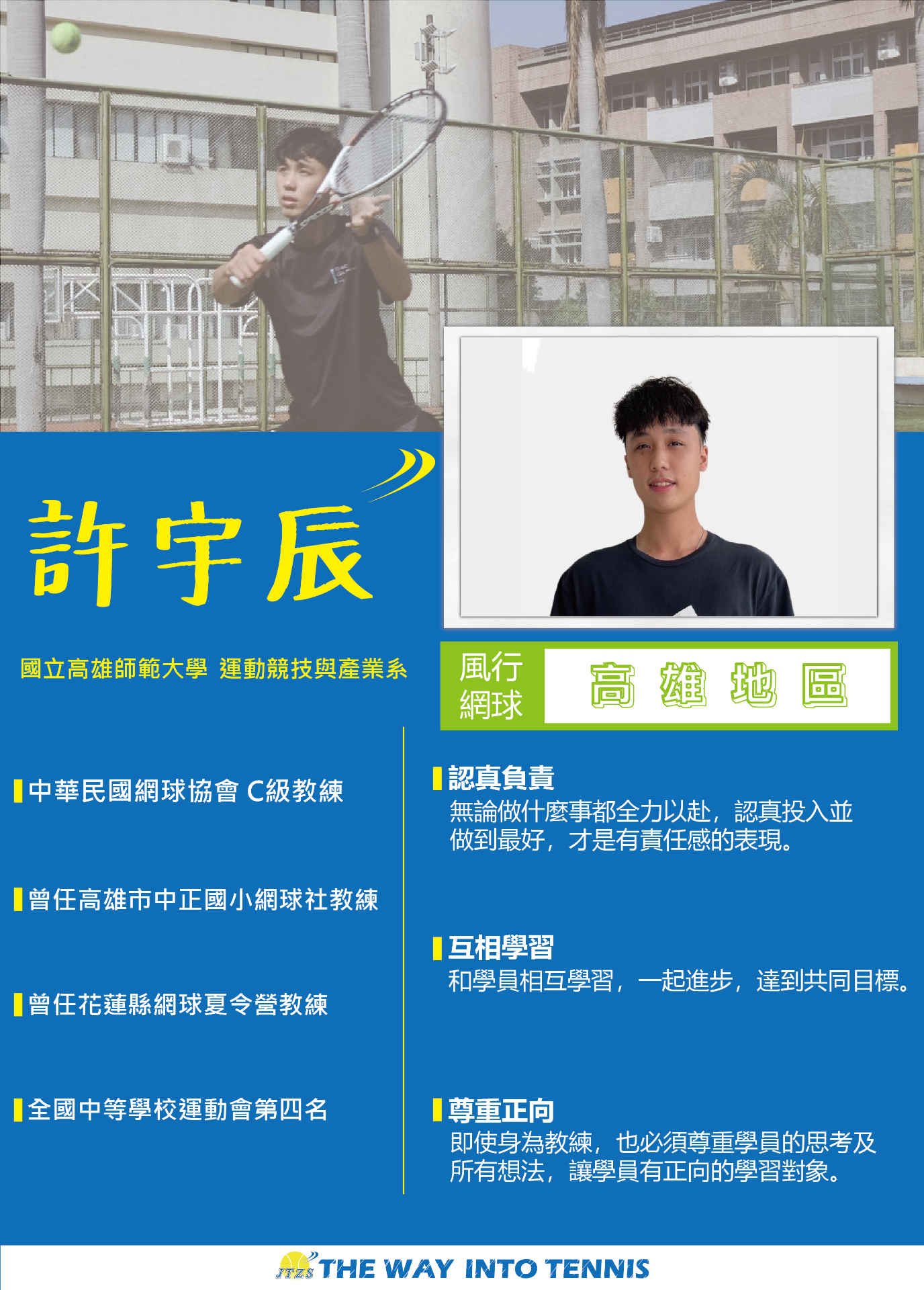 讓網球風行是多少網球愛好者、網球教練的嚮往,把這一個心願化作了一步又一步的真實,讓網球如風一般行走在臺灣的大街小巷,行走在每個人的心中。
