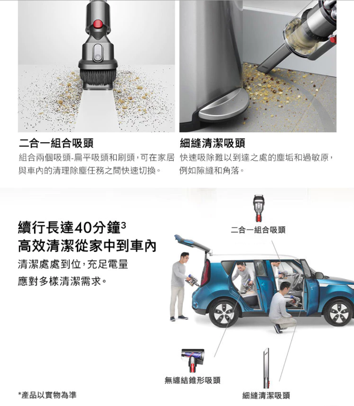 ● 40分鐘續航-鋰電池科技: 電池續航力增強,充電5小時,一般模式最高可使用40分鐘 ,使用電動吸頭25分鐘,強力模式5分鐘 。
