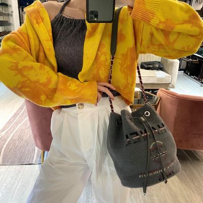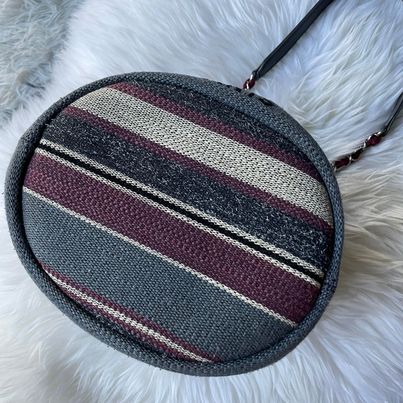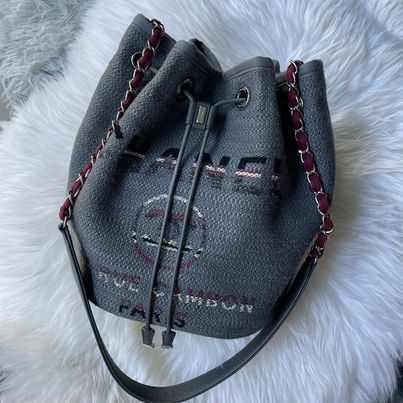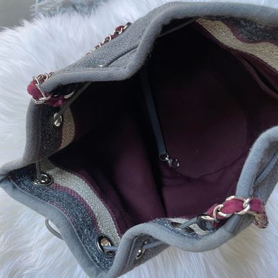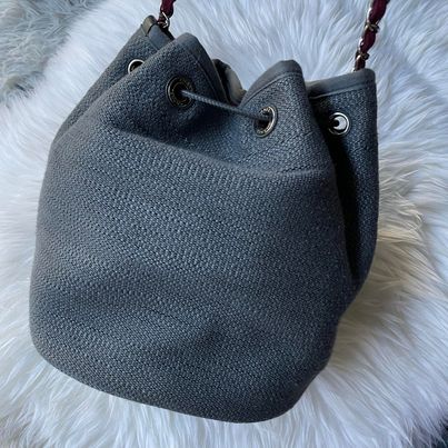 Chanel漢堡系列~ 灰銀條紋肩背沙灘水桶包 26開無配件 底部拼色超級美 (c logo掉了一個不影響美觀可自行去專櫃補)