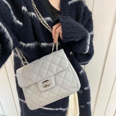 Chanel冰川灰銀釦雙層荔枝皮方胖子