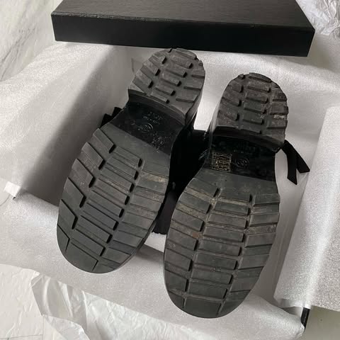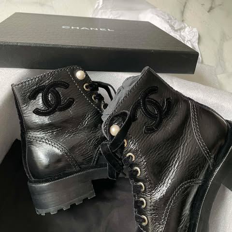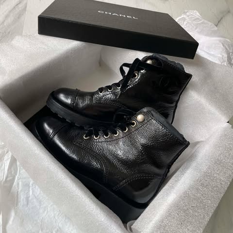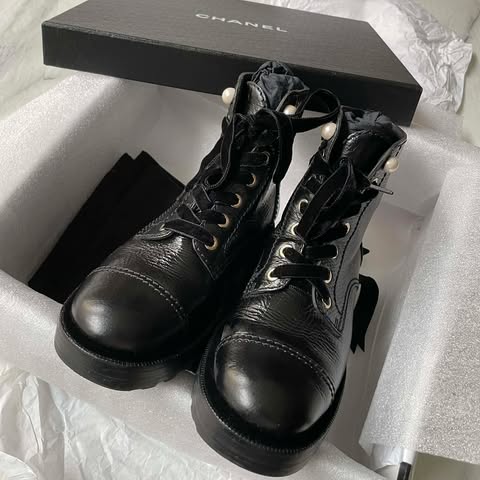 原價55000+ Chanel手工坊黑色珍珠油蠟馬丁靴 36半 全配件 logo是絲絨的~真的很美