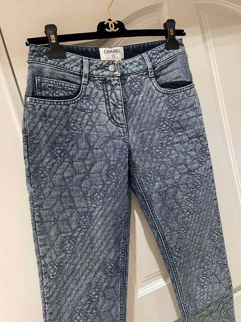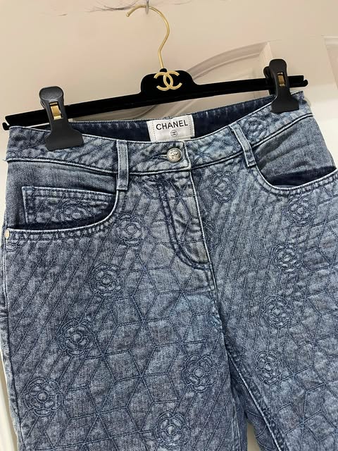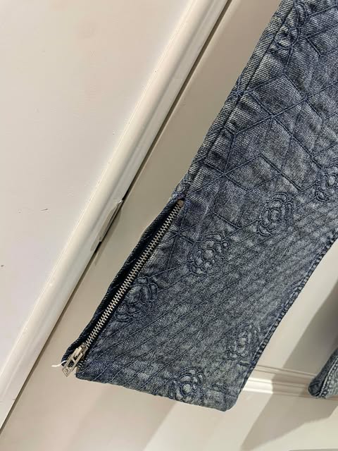 Chanel 山茶花滿logo牛仔褲 36碼 建議40kg左右的買 45kg穿起來有點合 腰34 臀44 長90 褲腳有拉鏈可以打開