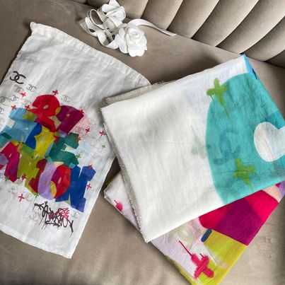 Chanel 彩色印花手繪感圍巾+收納袋 閒置未用有購證➗已送洗 蠻特別的現在買不到~ 很適合台灣的天氣 61%棉39%絲 手感舒適不紮