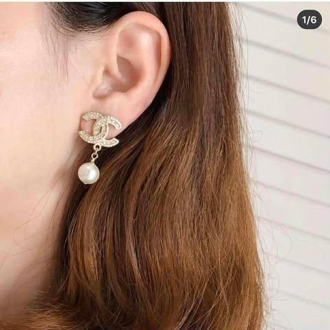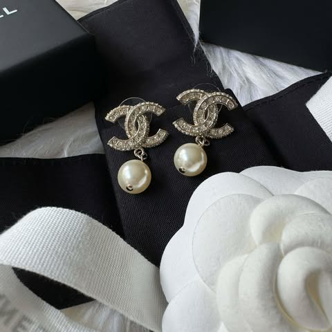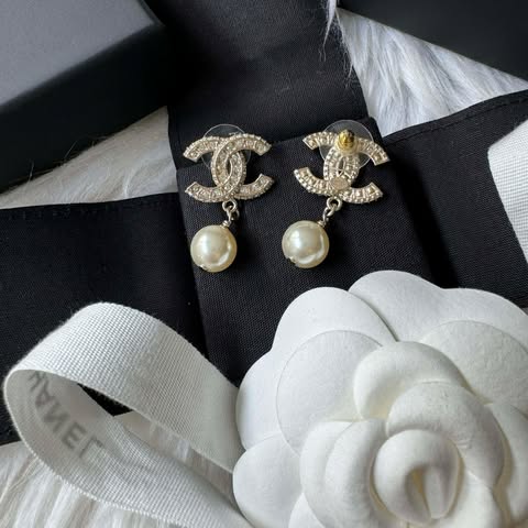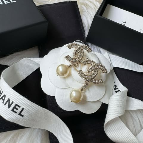 Chanel 珍珠水鑽吊飾耳針