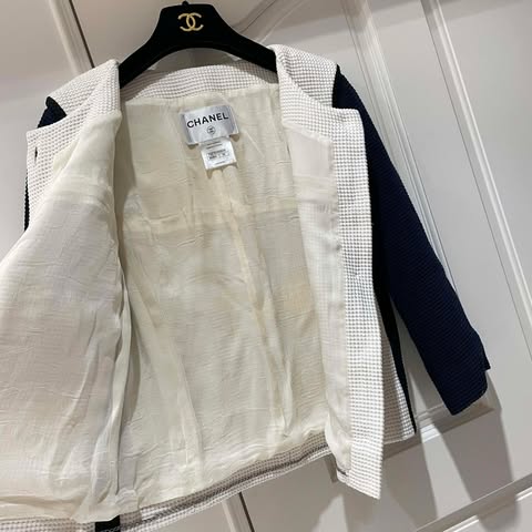 Chanel 秀款 深藍拼白華夫餅格紋針織外套
