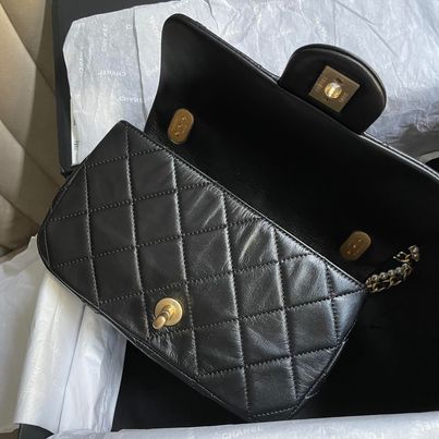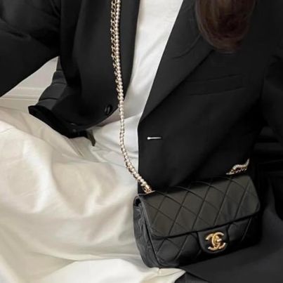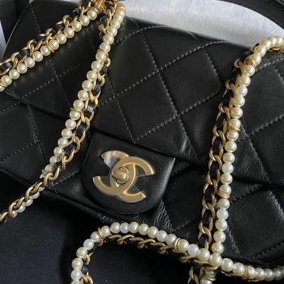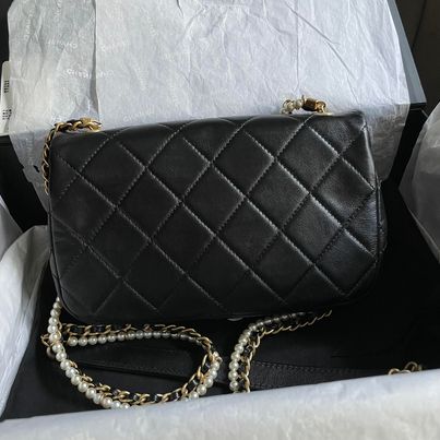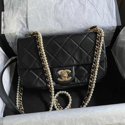 Chanel 黑金珍珠雙鏈條mini 30開配件有保卡塵袋 小牛皮材質成色新 上身就是千金風🖤🖤 尺寸20cm 手機輕鬆放