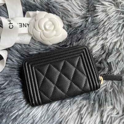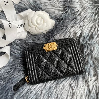 Chanel 黑金荔枝boy釦拉鍊零錢卡包