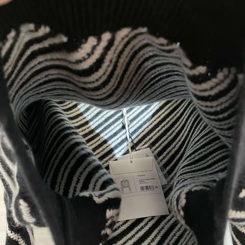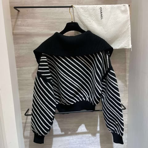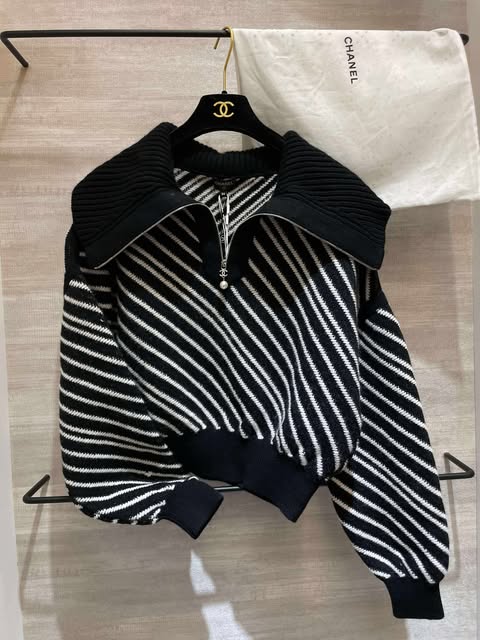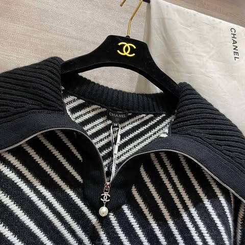 Chanel 21b黑白條紋針織翻領長袖 38碼 全新全配 原價10w 珍珠水鑽拉鍊真的太太美了