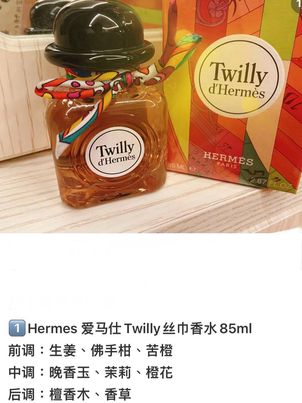 Hermes twilly 香水 全新85ml 送禮都沒問題 有分前中後調喔~ 前調:生薑,佛手柑,苦橙 中調:晚香玉,茉莉,橙花 後調:檀香木,香草