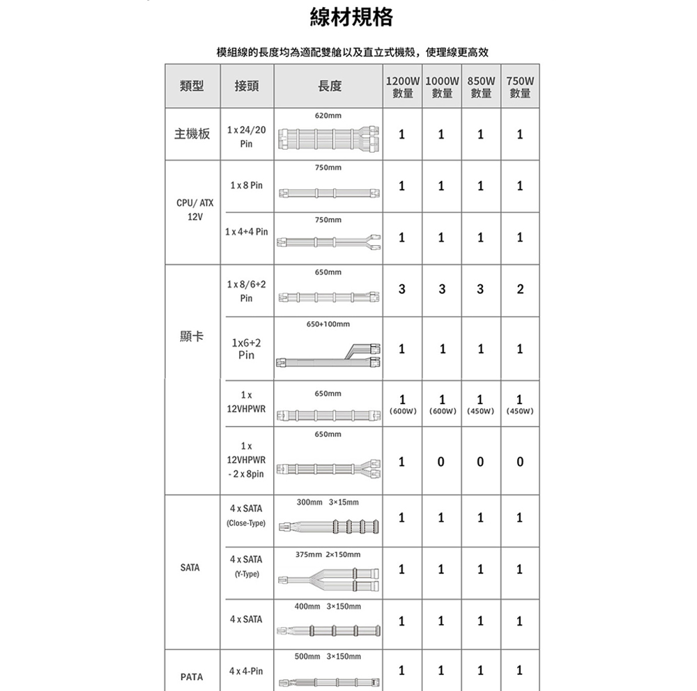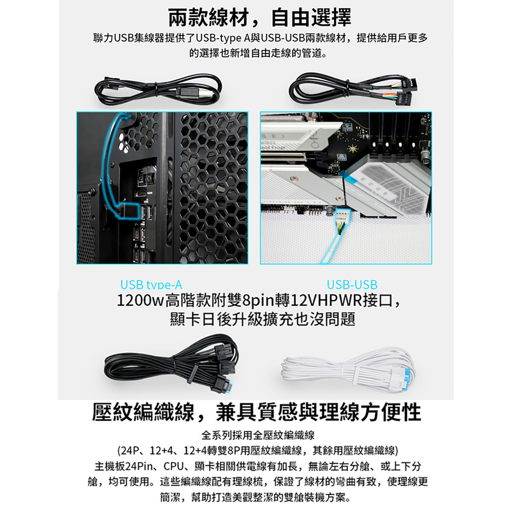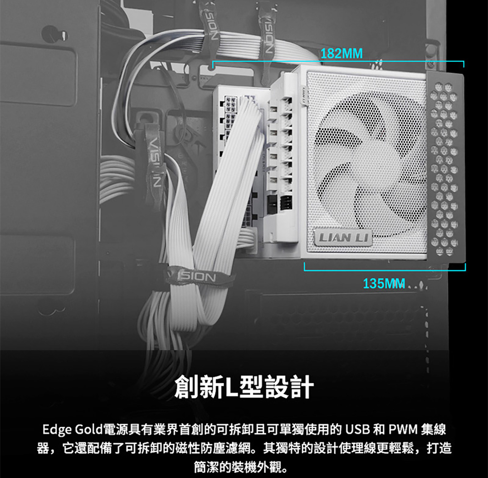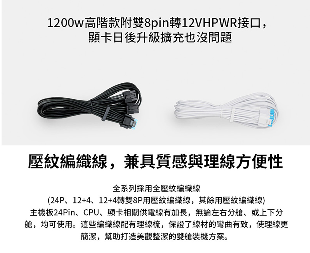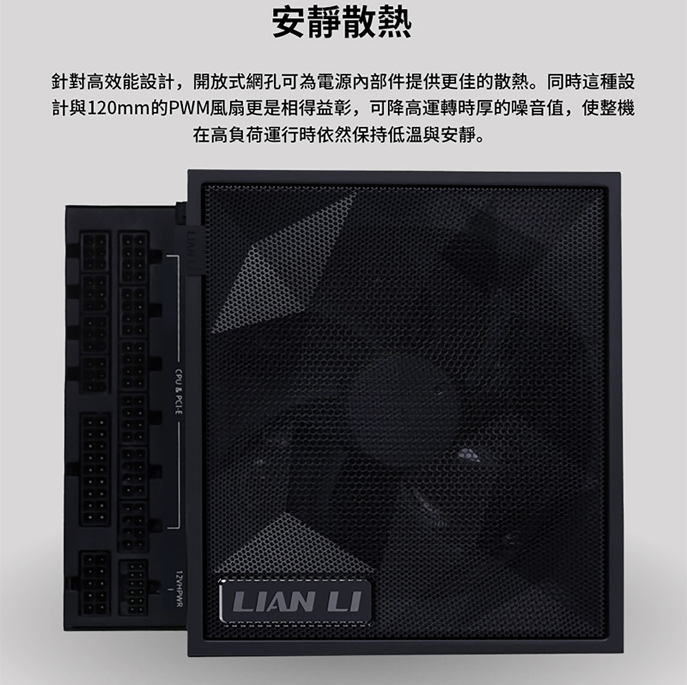L 型設計,專為雙腔彈殼量身打造 80 PLUS 金牌效率 支援 PCIe 5.1,採用自主研發的 12V-2×6 合金銅焊接端子 可拆卸式 USB 集線器,附 4 個內部 USB 2.0 接頭和 6 個 PWM 接頭,提供 1200W 和 1000W 兩種功率規格。 可拆式磁性風扇防塵過濾器 採用德國頂級工業級EPCOS電容器 全模組化編織紋理線纜,主機板/CPU/GPU連接器上預先安裝了理線梳。