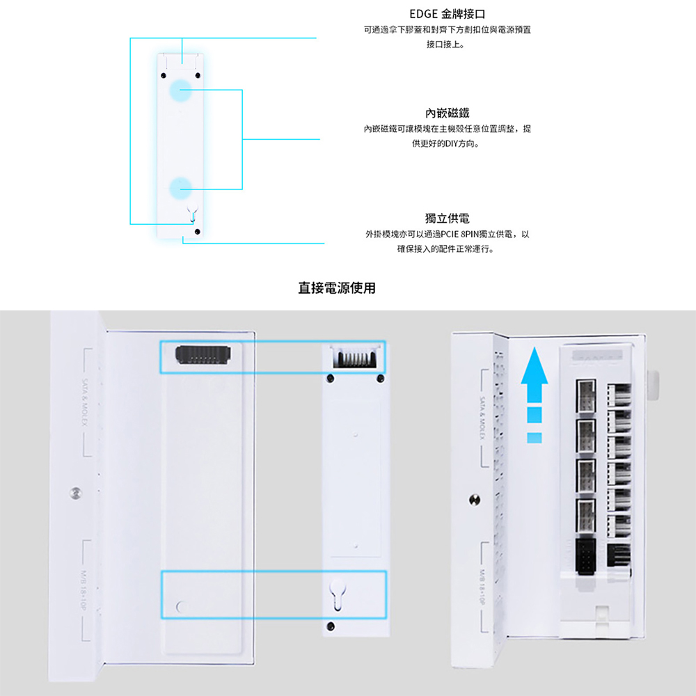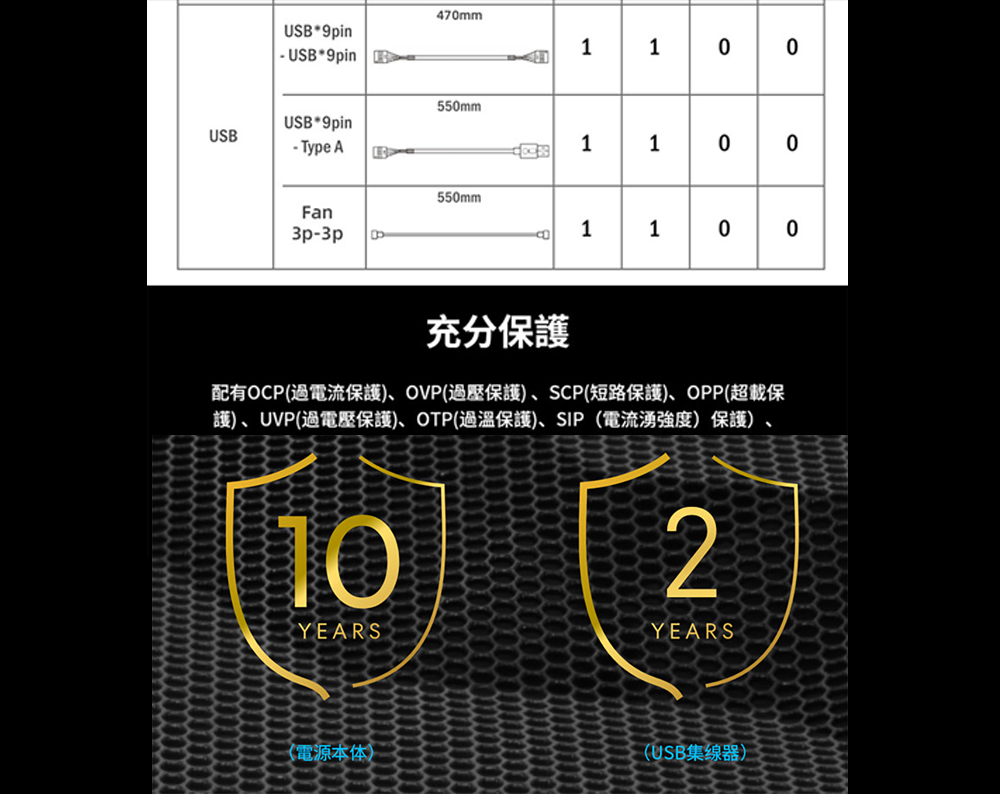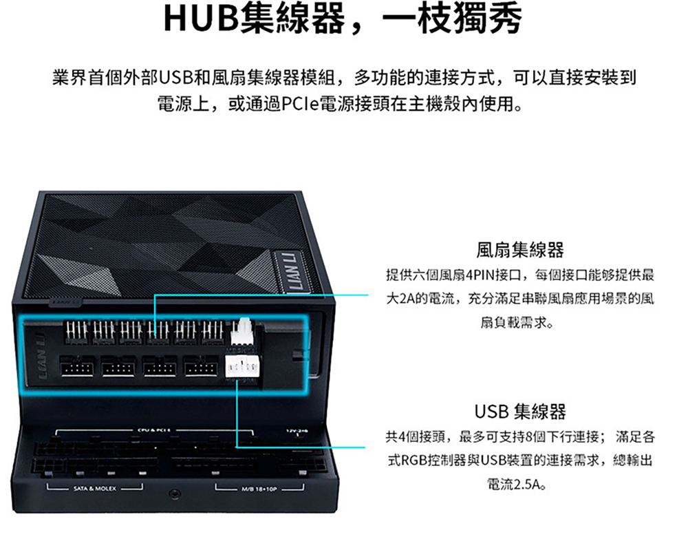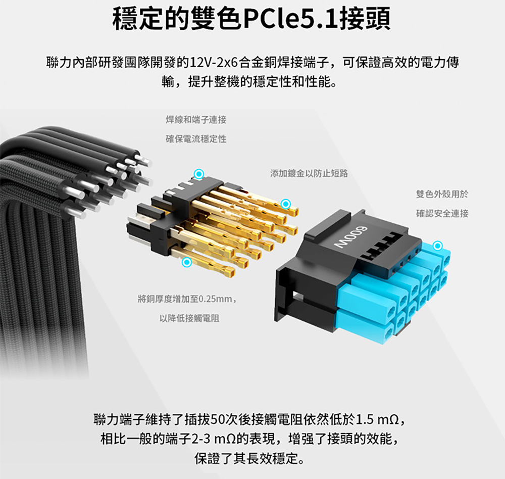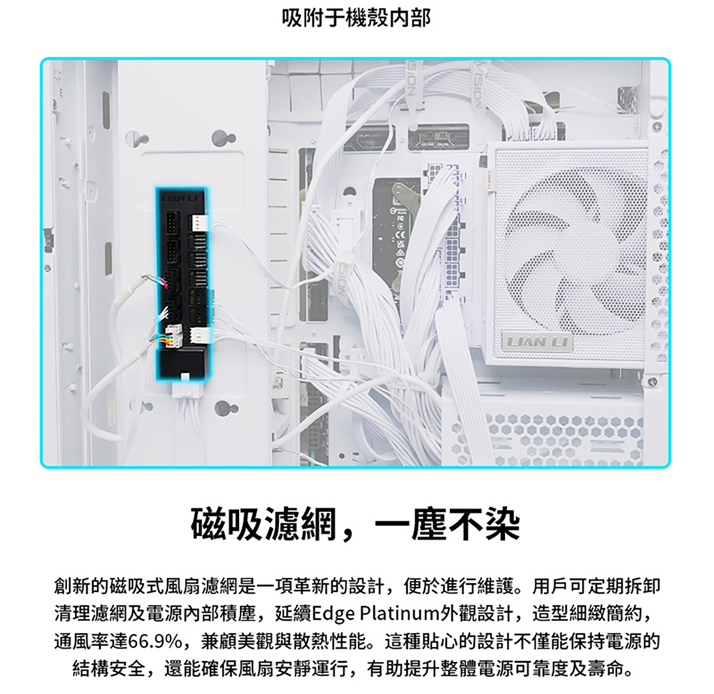 L 型設計,專為雙腔彈殼量身打造 80 PLUS 金牌效率 支援 PCIe 5.1,採用自主研發的 12V-2×6 合金銅焊接端子 可拆卸式 USB 集線器,附 4 個內部 USB 2.0 接頭和 6 個 PWM 接頭,提供 1200W 和 1000W 兩種功率規格。 可拆式磁性風扇防塵過濾器 採用德國頂級工業級EPCOS電容器 全模組化編織紋理線纜,主機板/CPU/GPU連接器上預先安裝了理線梳。