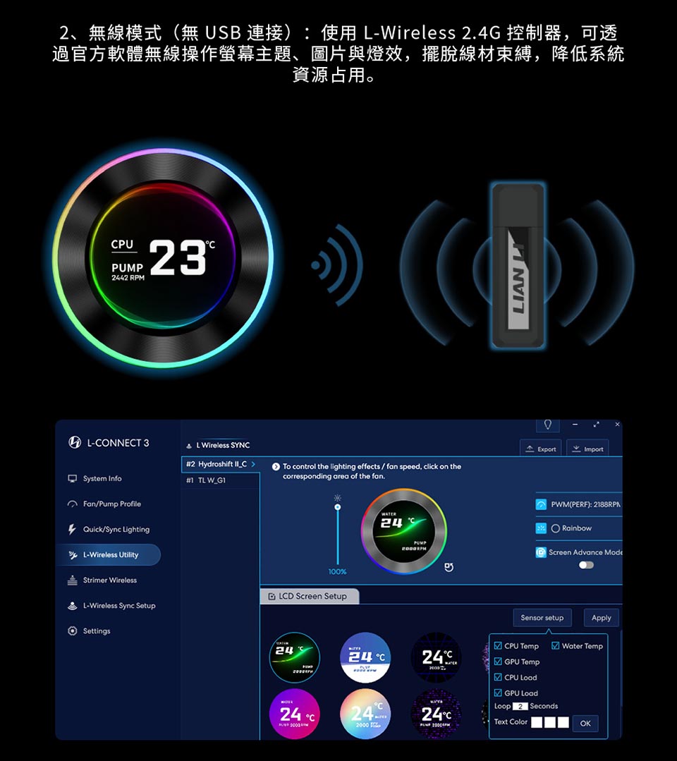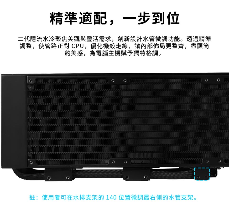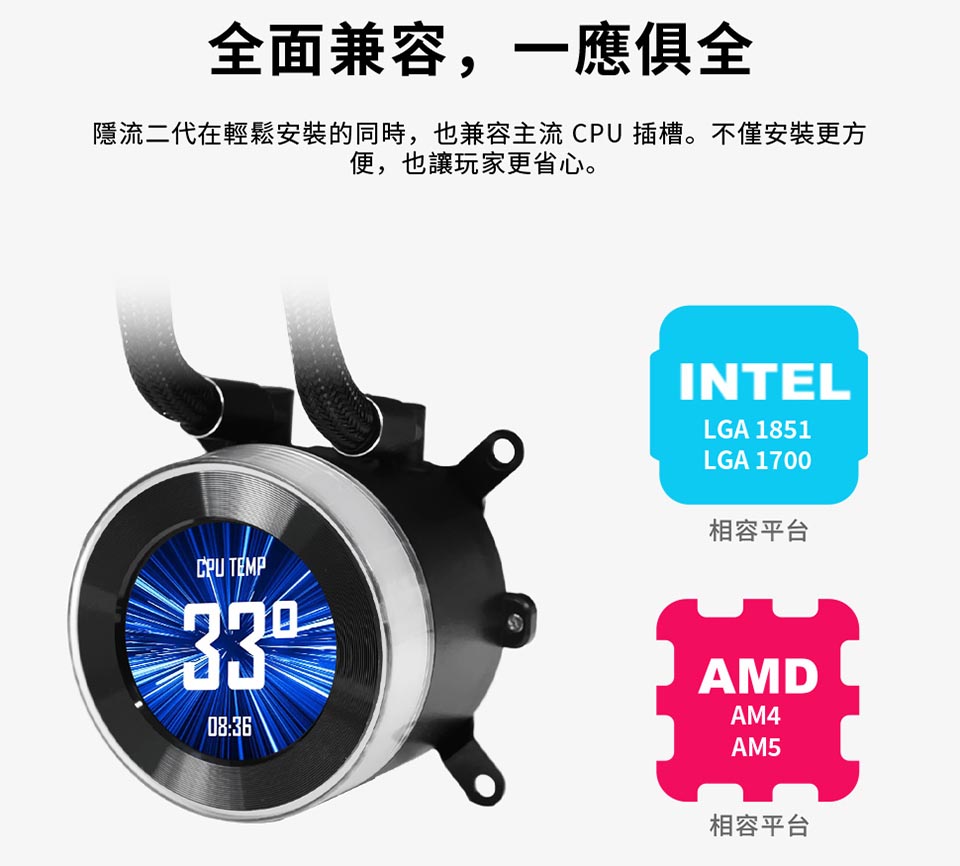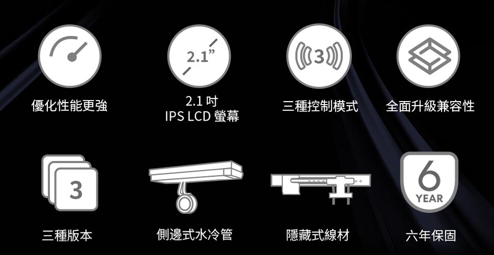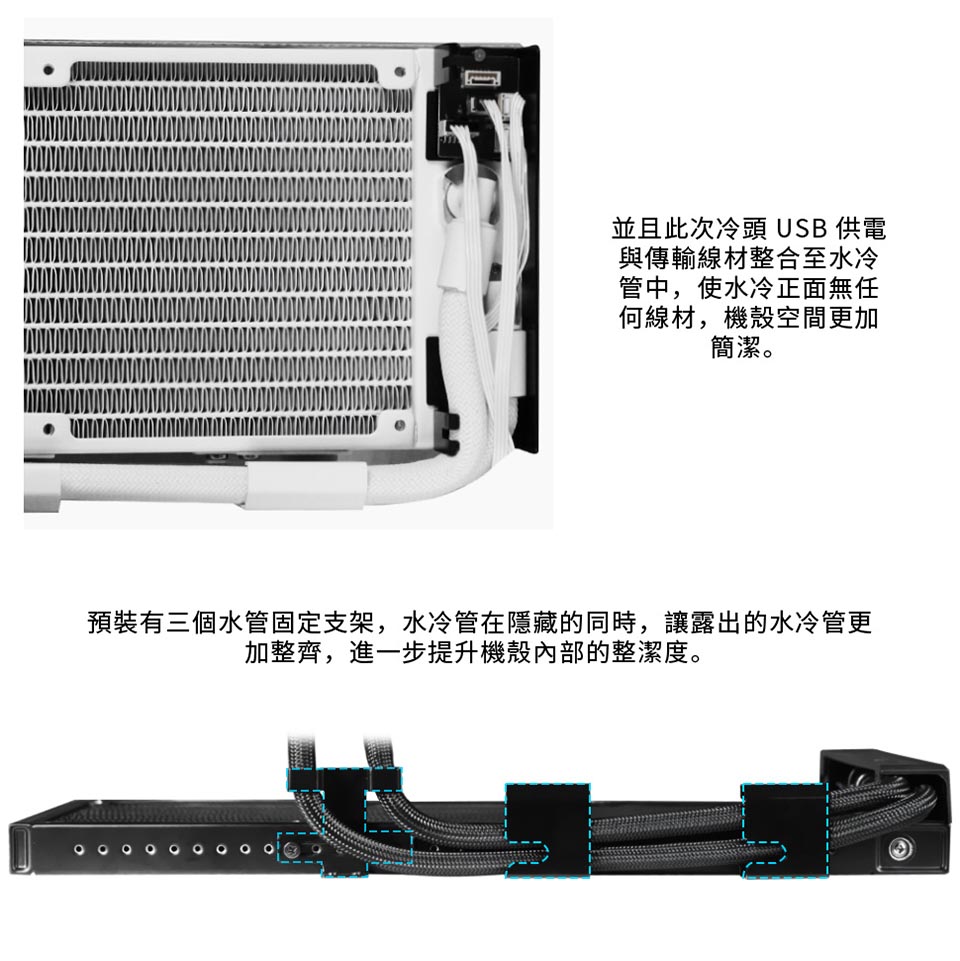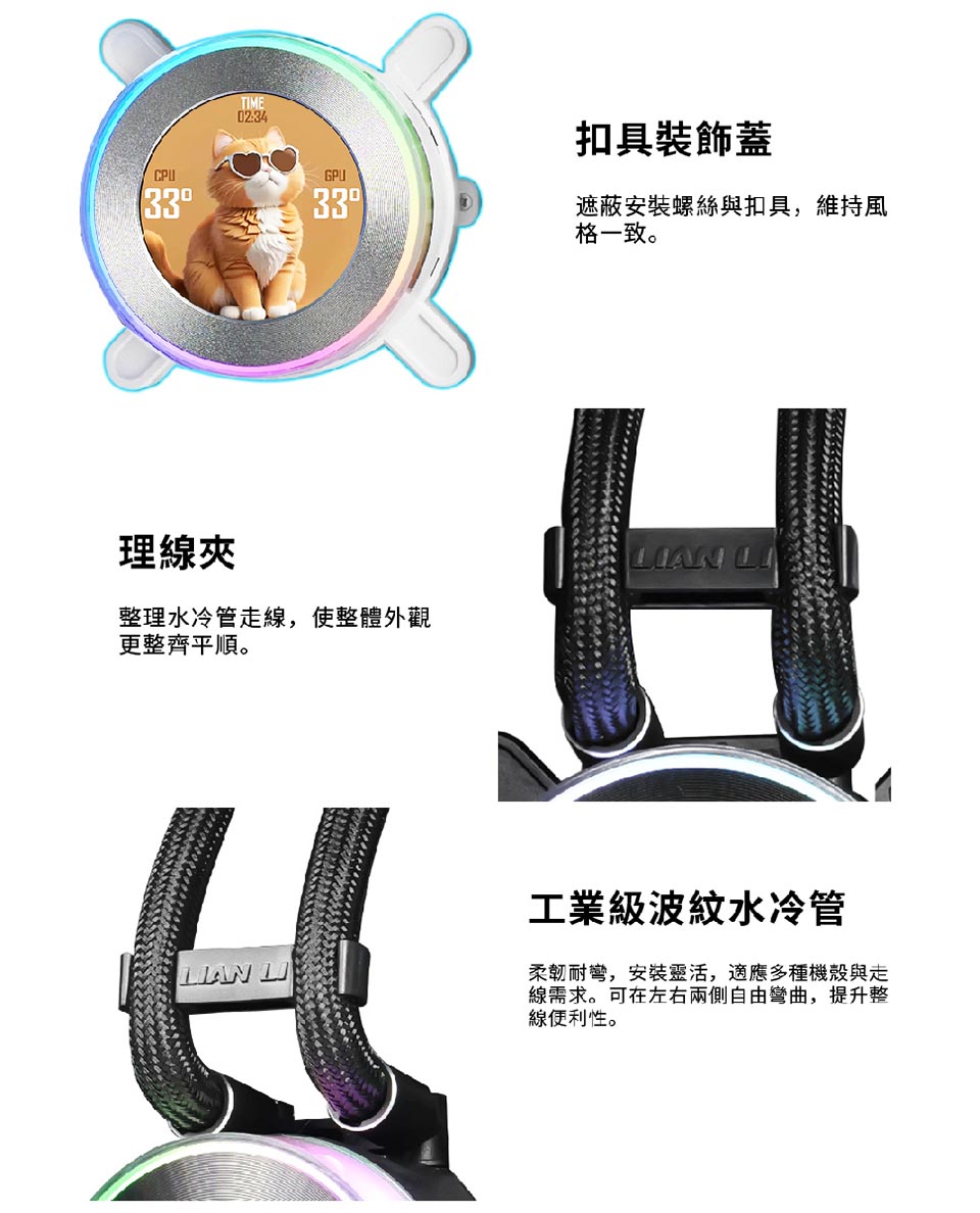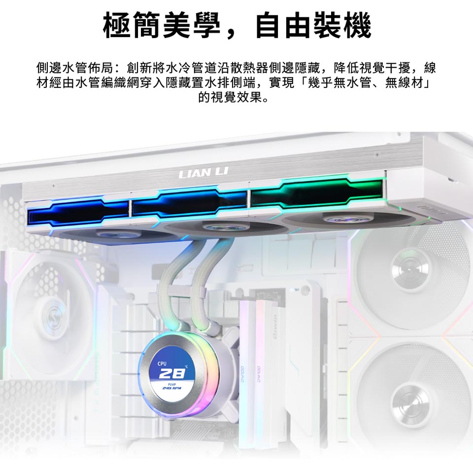 側裝管道和隱藏式接線,呈現簡約、無管的外觀。 配備 2.1 吋 IPS LCD,解析度為 480×480,亮度為 500 尼特,更新率為 60Hz。 提供離線、無線和進階 USB 連接控制模式。 三種配置:TL 無線、CL 無線或無風扇,可實現完全 DIY 靈活性。 精密管道對準,可調節路線,實現更清潔的構造。 纖薄的 360 毫米散熱器(400×122×24 毫米),增強了機箱相容性。 預先安裝 UNI FAN 並支援 L-Connect 3 軟體客製化。 包括重新設計的安裝支架和 6 年保固。