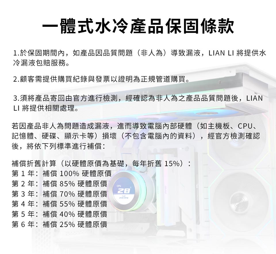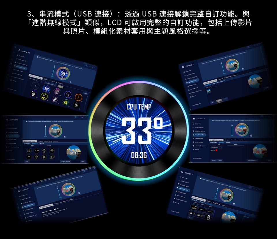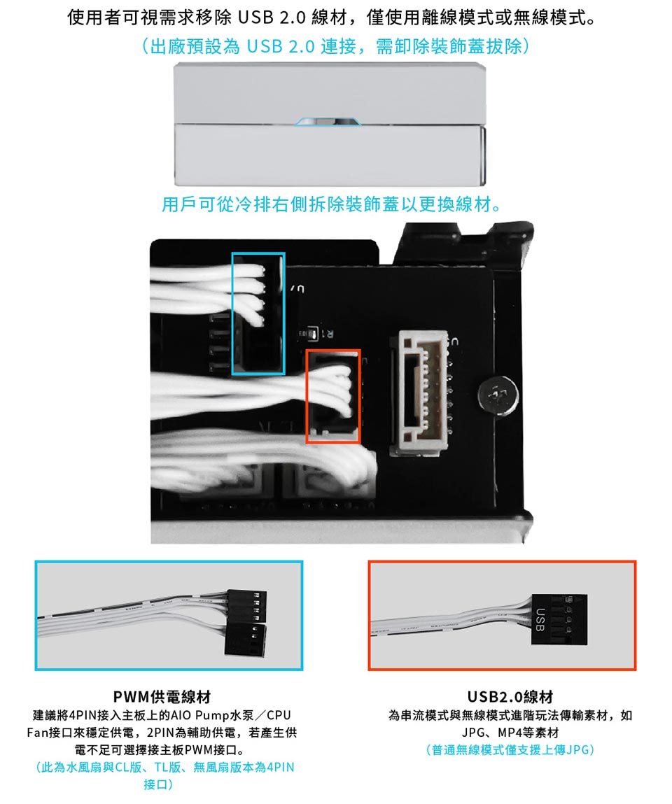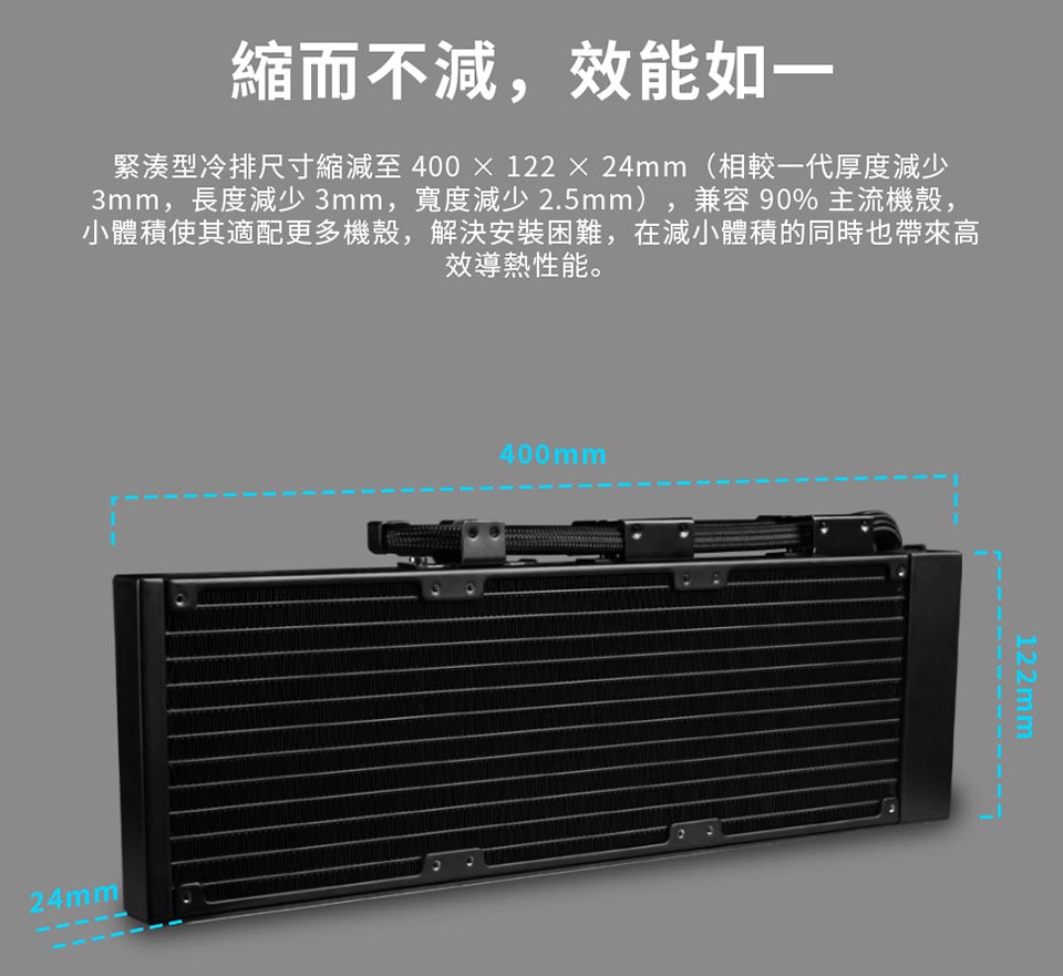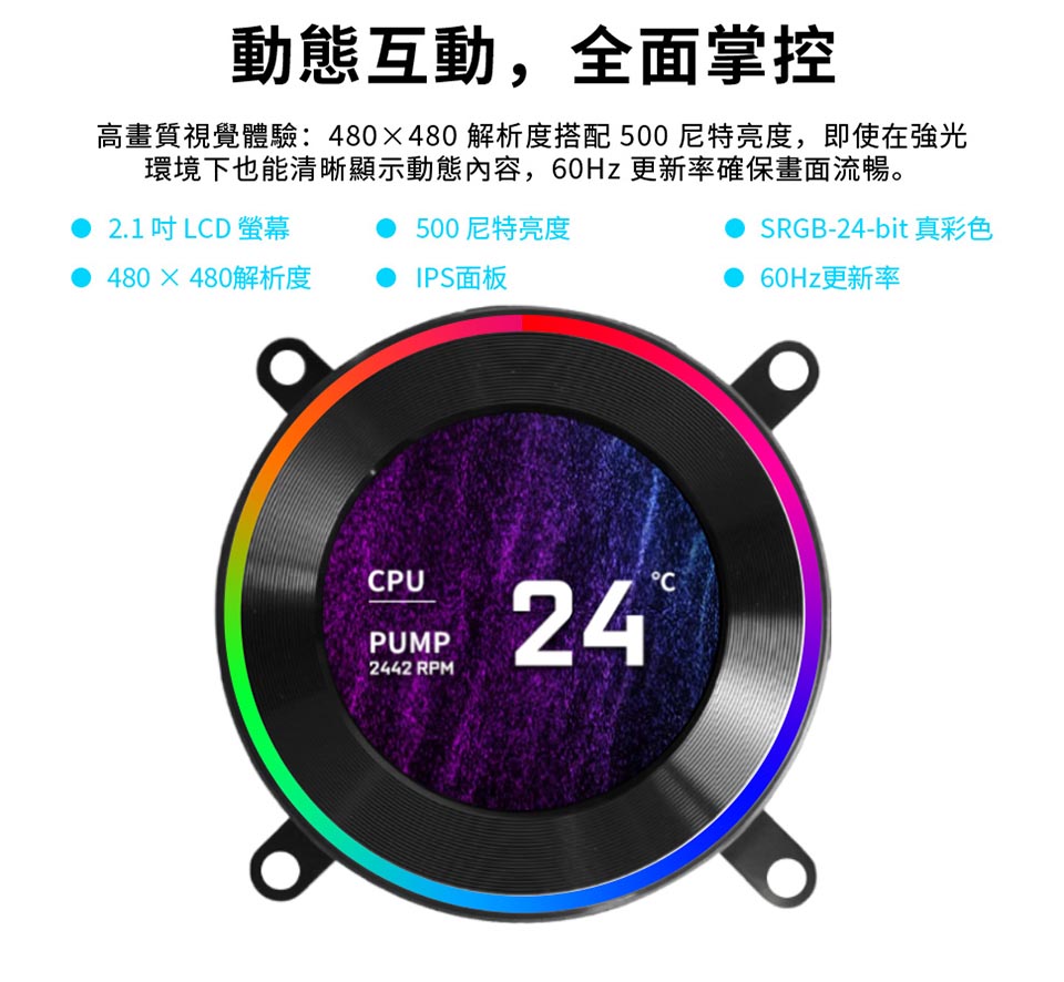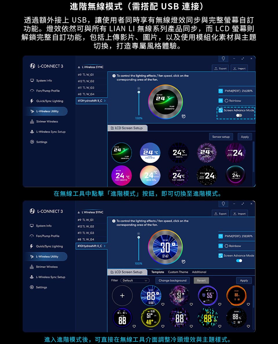 側裝管道和隱藏式接線,呈現簡約、無管的外觀。 配備 2.1 吋 IPS LCD,解析度為 480×480,亮度為 500 尼特,更新率為 60Hz。 提供離線、無線和進階 USB 連接控制模式。 三種配置:TL 無線、CL 無線或無風扇,可實現完全 DIY 靈活性。 精密管道對準,可調節路線,實現更清潔的構造。 纖薄的 360 毫米散熱器(400×122×24 毫米),增強了機箱相容性。 預先安裝 UNI FAN 並支援 L-Connect 3 軟體客製化。 包括重新設計的安裝支架和 6 年保固。