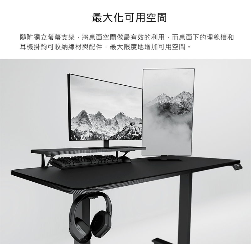 隨附獨立螢幕支架,將桌面空間做最有效的利用,而桌面下的理線槽和耳機掛鉤可收納線材與配件,最大限度地增加可用空間。