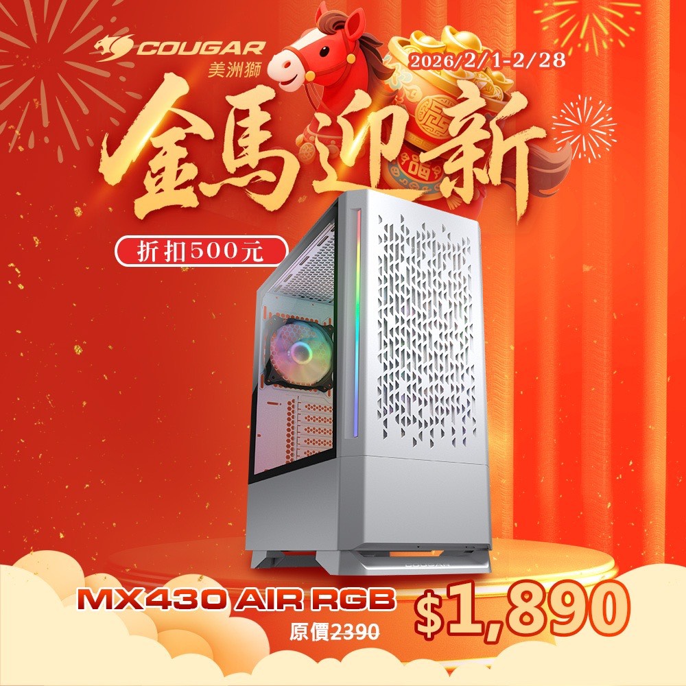 通風面板設計 ARGB中塔機箱MX430 Air RGB 的前面板採現代風格圖案設計,兼具通風功能提升散熱效率,搭配兩側 LED 燈條為你的  配置增添迷人電競風采。內建三個 120mm ARGB 風扇,緊湊的空間設計使其容納最長 320mm 顯示卡、最長280 mm 水冷排及最長 175 mm CPU 散熱器,展現卓越的支援能力。COUGARCOUGAR現代風格圖案通風孔前面板設計前面板採現代風格圖案通風孔設計,不僅能提升散熱性能,ARGB 風扇更藉由通風孔散發出若隱若現的燈效,是一款集簡約與散熱效能於一體的迷人機箱。迷人出色的 RGB 燈效MX430 Air RGB 隨處可見迷人的 RGB 燈效,包括前面板兩側 LED燈條、內建三個 120 mm ARGB 風扇,皆可透過前面板 RGB 按鈕即時切換豐富燈效。此外,隨附配有 5V ARGB 連接頭的 LED 控制器,與主機板連接後即可同步燈效,創造迷人的 RGB 氛圍。  --1923-3